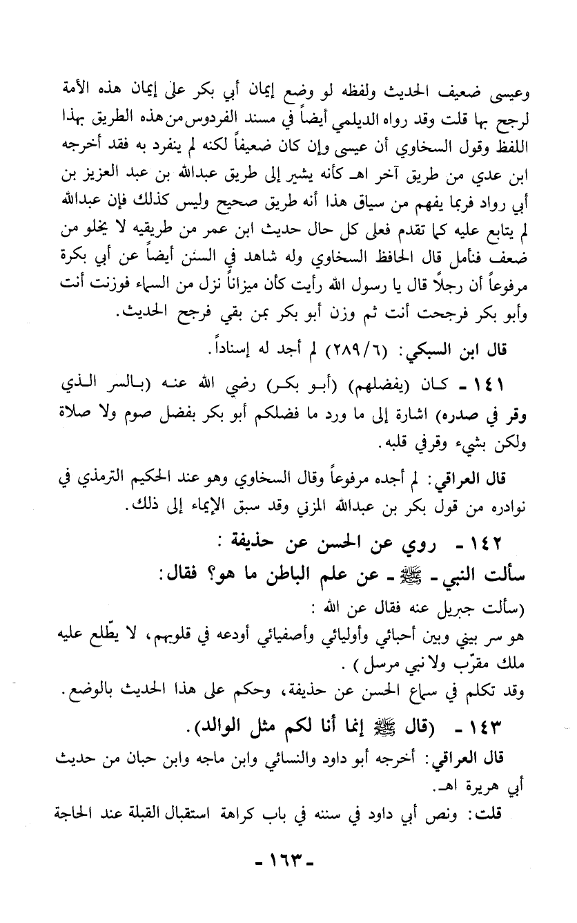 وعيسى ضعيف الحديث ولفظه لو وضع إيمان أبي بكر على إيمان هذه الأمة لرجح بها قلت وقد رواه الديلمي أيضاً في مسند الفردوس من هذه الطريق بهذا اللفظ وقول السخاوي أن عيسى وإن كان ضعيفاً لكنه لم ينفرد به فقد أخرجه ابن عدي من طريق آخر اهـ كأنه يشير إلى طريق عبد الله بن عبد العزيز بن أبي رواد فربما يفهم من سياق هذا أنه طريق صحيح وليس كذلك فإن عبد الله لم يتابع عليه كما تقدم فعلى كل حال حديث ابن عمر من طريقيه لا يخلو من ضعف فنأمل قال الحافظ السخاوي وله شاهد في السنن أيضاً عن أبي بكرة مرفوعاً أن رجلاً قال يا رسول الله رأيت كأن ميزاناً نزل من السماء فوزنت أنت وأبو بكر فرجحت أنت ثم وزن أبو بكر بمن بقي فرجح الحديث.