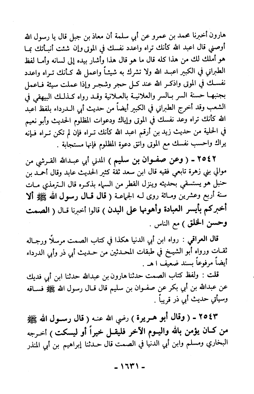 قلت: ولفظ كتاب الصمت حدثنا هارون بن عبد الله حدثنا ابن أبي فديك عن عبد الله بن أبي بكر عن صفوان بن سليم قال قال رسول الله - صلّى الله عليه وسلم - فساقه وسيأتي حديث أبي ذر قريباً.