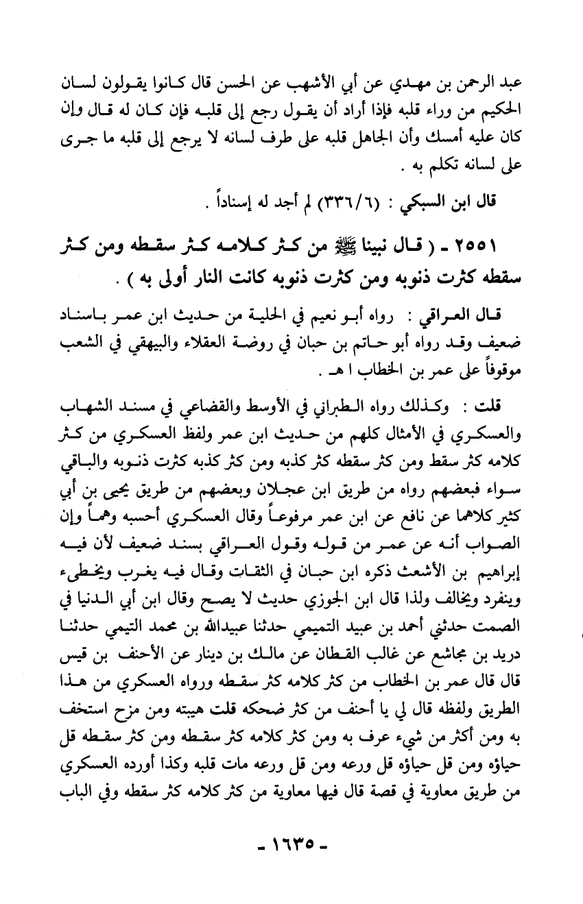 قلت: وكذلك رواه الطبراني في الأوسط والقضاعي في مسند الشهاب والعسكري في الأمثال كلهم من حديث ابن عمر ولفظ العسكري من كثر كلامه كثر سقط ومن كثر سقطه كثر كذبه ومن كثر كذبه كثرت ذنوبه والباقي سواء فبعضهم رواه من طريق ابن عجلان وبعضهم من طريق يحيى بن أبي كثير كلاهما عن نافع عن ابن عمر مرفوعاً وقال العسكري أحسبه وهماً وإن الصواب أنه عن عمر من قوله وقول العراقي بسند ضعيف لأن فيه إبراهيم بن الأشعث ذكره ابن حبان في الثقات وقال فيه يغرب ويخطئ وينفرد ويخالف ولذا قال ابن الجوزي حديث لا يصح وقال ابن أبي الدنيا في الصمت حدثني أحمد بن عبيد التميمي حدثنا عبيد الله بن محمد التيمي حدثنا دريد بن مجاشع عن غالب القطان عن مالك بن دينار عن الأحنف بن قيس قال قال عمر بن الخطاب من كثر كلامه كثر سقطه ورواه العسكري من هذا الطريق ولفظه قال لي يا أحنف من كثر ضحكه قلت هيبته ومن مزح استخف به ومن أكثر من شيء عرف به ومن كثر كلامه كثر سقطه ومن كثر سقطه قل حياؤه ومن قل حياؤه قل ورعه ومن قل ورعه مات قلبه وكذا أورده العسكري من طريق معاوية في قصة قال فيها معاوية من كثر كلامه كثر سقطه وفي الباب