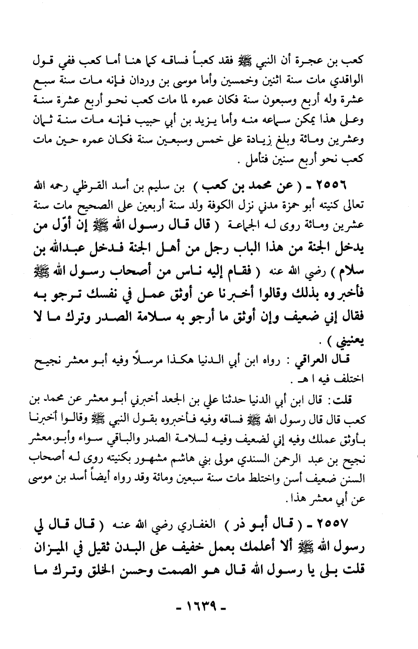 قلت: قال ابن أبي الدنيا حدثنا علي بن الجعد أخبرني أبو معشر عن محمد بن كعب قال قال رسول الله - صلّى الله عليه وسلم - فساقه وفيه فأخبروه بقول النبي - صلّى الله عليه وسلم - وقالوا أخبرنا بأوثق عملك وفيه إني لضعيف وفيه لسلامة الصدر والباقي سواء وأبو معشر نجيح بن عبد الرحمن السندي موسى بني هاشم مشهور بكنيته روى له أصحاب السنن ضعيف أسن واختلط مات سنة سبعين ومائة وقد رواه أيضاً أسد بن موسى عن أبي معشر هذا.