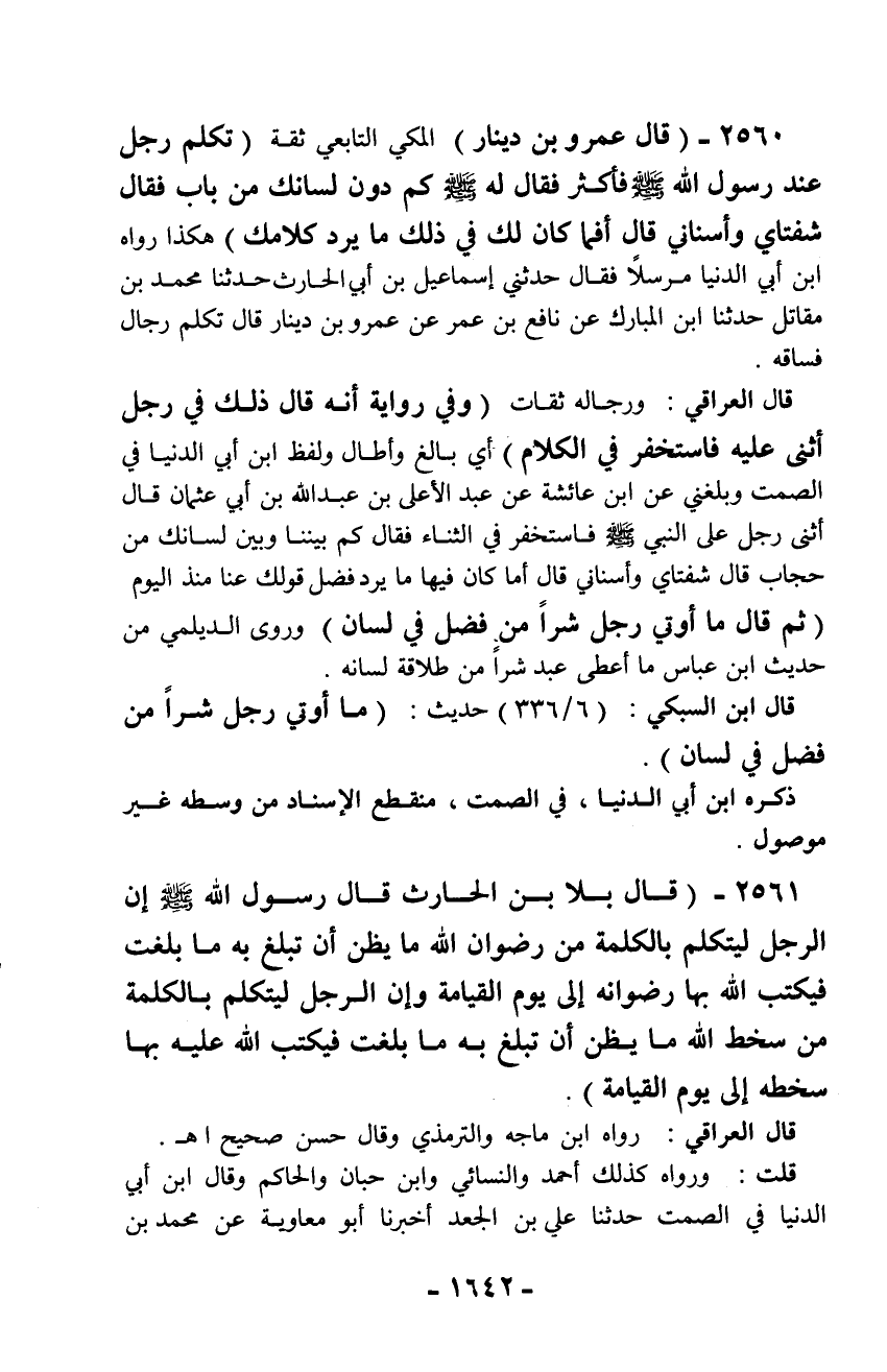 2560 - (قال عمرو بن دينار) المكي التابعي ثقة (تكلم رجل عند رسول الله - صلّى الله عليه وسلم - فأكثر فقال له - صلّى الله عليه وسلم - كم دون لسانك من باب فقال شفتاي وأسناني قال أفما كان لك في ذلك ما يرد كلامك) هكذا رواه ابن أبي الدنيا مرسلاً فقال حدثني إسماعيل بن أبي الحارث حدثنا محمد بن مقاتل حدثنا ابن المبارك عن نافع بن عمر عن عمرو بن دينار قال تكلم رجال فساقه.