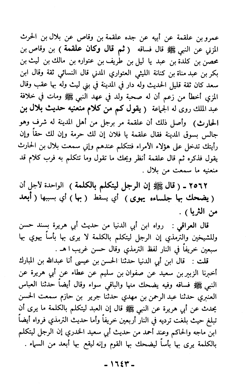 عمرو بن علقمة عن أبيه عن جده علقمة بن وقاص عن بلال بن الحرث المزني عن النبي - صلّى الله عليه وسلم - قال فساقه (ثم قال وكان علقمة) بن وقاص بن محصن بن كلدة بن عبد يا ليل بن طريف بن عتواره بن مالك بن ليث بن بكر بن عبد مناة بن كنانة الليثي العتواري المدني قال النسائي ثقة وقال ابن سعد كان ثقة قليل الحديث وله دار في المدينة في بني ليث وله بها عقب وقال المزي أخطأ من زعم أن له صحبة ولد في عهد النبي - صلّى الله عليه وسلم - ومات في خلافة عبد الملك روى له الجماعة (يقول كم من كلام منعنيه حديث بلال بن الحارث) وأصل ذلك أن علقمة مر برجل من أهل المدينة له شرف وهو جالس بسوق المدينة فقال علقمة يا فلان إن لك حرمة وإن لك حقاً وإن رأيتك تدخل على هؤلاء الأمراء فتتكلم عندهم وإني سمعت بلال بن الحارث يقول فذكره ثم قال علقمة أنظر ويحك ما تقول وما تتكلم به فرب كلام قد منعنيه ما سمعت من بلال.