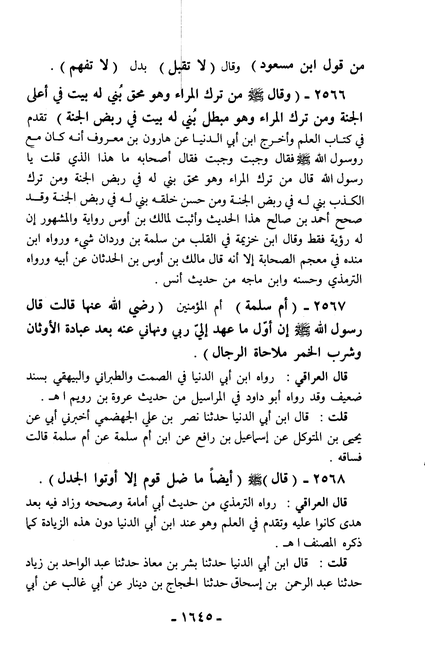 2566 - (وقال - صلّى الله عليه وسلم - من ترك المراء وهو محق بُني له بيت في أعلى الجنة ومن ترك المراء وهو مبطل بُني له بيت في ربض الجنة) تقدم في كتاب العلم وأخرج ابن أبي الدنيا عن هارون بن معروف أنه كان مع رسول الله - صلّى الله عليه وسلم - فقال وجبت وجبت فقال أصحابه ما هذا الذي قلت يا رسول الله قال من ترك المراء وهو محق بني له في ربض الجنة ومن ترك الكذب بني له في ربض الجنة ومن حسن خلقه بني له في ربض الجنة وقد صحح أحمد بن صالح هذا الحديث وأثبت لمالك بن أوس رواية والمشهور إن له رؤية فقط وقال ابن خزيمة في القلب من سلمة بن وردان شيء ورواه ابن منده في معجم الصحابة إلا أنه قال مالك بن أوس بن الحدثان عن أبيه ورواه الترمذي وحسنه وابن ماجه من حديث أنس.