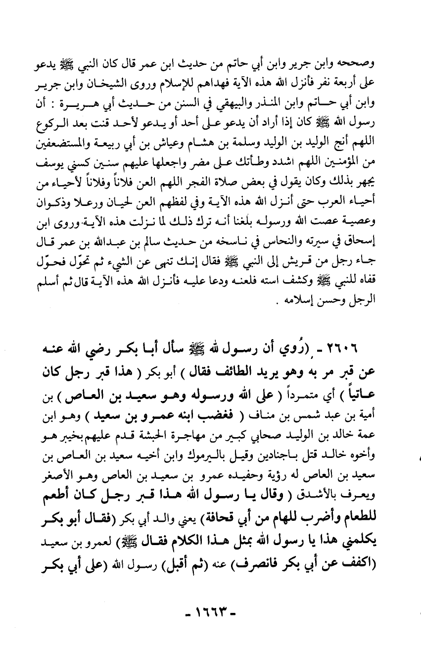 2606 - (رُوي أن رسول لله - صلّى الله عليه وسلم - سأل أبا بكر رضي الله عنه عن قبر مر به وهو يريد الطائف فقال) أبو بكر (هذا قبر رجل كان عاتياً) أي متمرداً (على الله ورسوله وهو سعيد بن العاص) بن أمية بن عبد شمس بن مناف (فغضب ابنه عمرو بن سعيد) وهو ابن عمة خالد بن الوليد صحابي كبير من مهاجرة الحبشة قدم عليهم بخيبر هو وأخوه خالد قتل بأجنادين وقيل باليرموك وابن أخيه سعيد بن العاص بن سعيد بن العاص له رؤية وحفيده عمرو بن سعيد بن العاص وهو الأصغر ويعرف بالأشدق (وقال يا رسول الله هذا قبر رجل كان أطعم للطعام وأضرب للهام من أبي قحافة) يعني والد أبي بكر (فقال أبو بكر يكلمني هذا يا رسول الله بمثل هذا الكلام فقال - صلّى الله عليه وسلم -) لعمرو بن سعيد (اكفف عن أبي بكر فانصرف) عنه (ثم أقبل) رسول الله (على أبي بكر