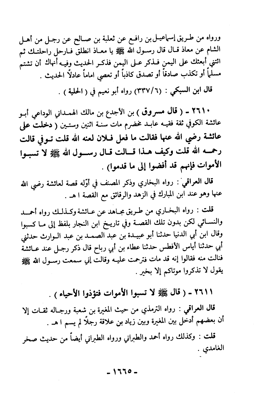 2610 - (قال مسروق) بن الأجدع بن مالك الهمداني الوداعي أبو عائشة الكوفي ثقة فقيه عابد مخضرم مات سنة اثنين وستين (دخلت على عائشة رضي الله عنها فقالت ما فعل فلان لعنه الله قلت توفي قالت رحمه الله قلت وكيف هذا قالت قال رسول الله - صلّى الله عليه وسلم - لا تسبوا الأموات فإنهم قد أفضوا إلى ما قدموا).