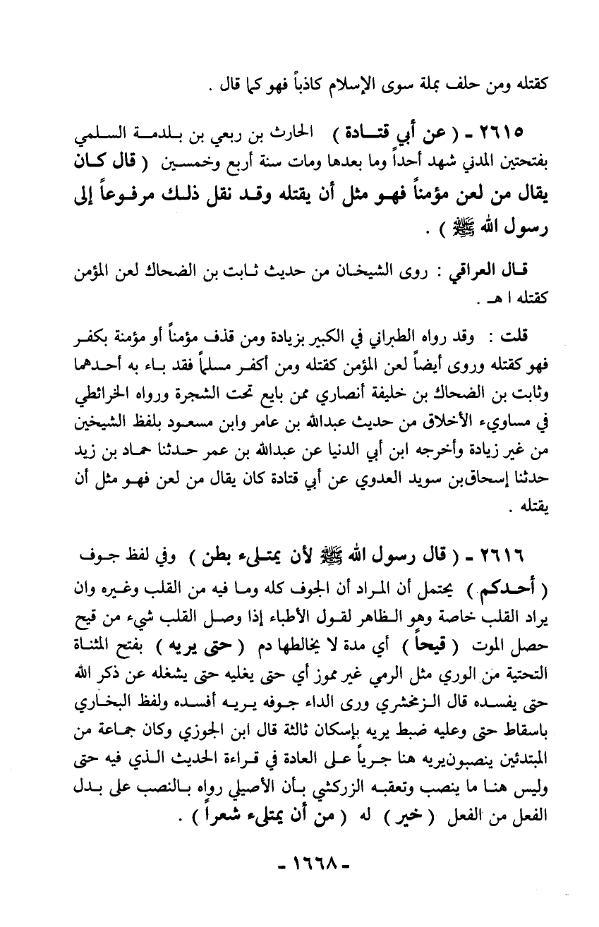 2615 - (عن أبي قتادة) الحارث بن ربعي بن بلدمة السلمي بفتحتين المدني شهد أحداً وما بعدها ومات سنة أربع وخمسين (قال كان يقال من لعن مؤمناً فهو مثل أن يقتله وقد نقل ذلك مرفوعاً إلى رسول الله - صلّى الله عليه وسلم -).