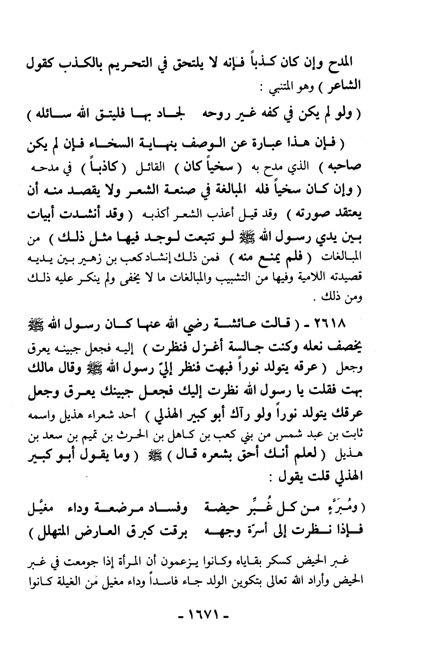 2618 - (قالت عائشة رضي الله عنها كان رسول الله - صلّى الله عليه وسلم - يخصف نعله وكنت جالسة أغزل فنظرت) إليه فجعل جبينه يعرق وجعل (عرقه يتولد نوراً فبهت فنظر إليّ رسول الله - صلّى الله عليه وسلم - وقال مالك بهت فقلت يا رسول الله نظرت إليك فجعل جبينك يعرق وجعل عرقك يتولد نوراً ولو رآك أبو كبير الهذلي) أحد شعراء هذيل واسمه ثابت بن عبد شمس من بني كعب بن كاهل بن الحرث بن تميم بن سعد بن هذيل (لعلم أنك أحق بشعره قال) - صلّى الله عليه وسلم - (وما يقول أبو كبير الهذلي قلت يقول:
