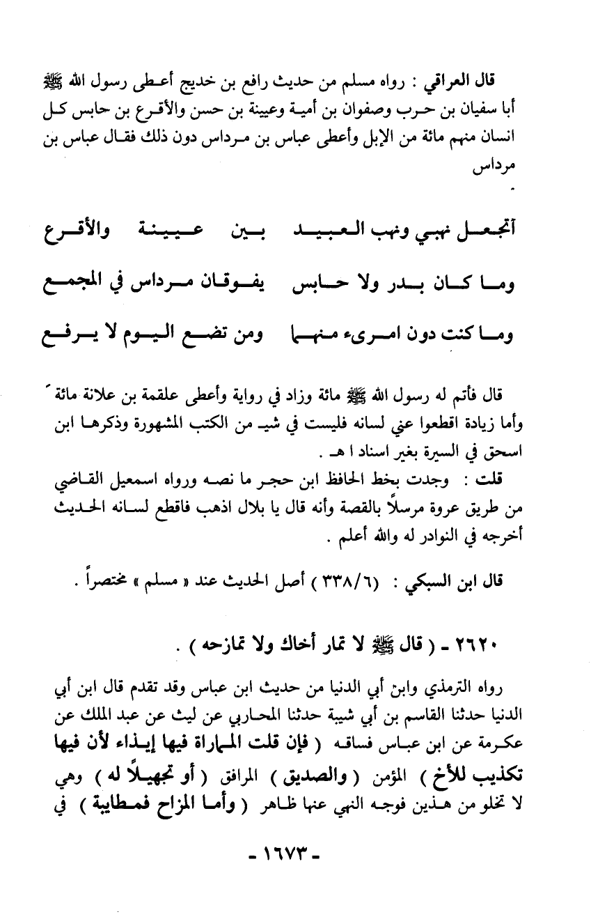 قال العراقي: رواه مسلم من حديث رافع بن خديج أعطى رسول الله - صلّى الله عليه وسلم - أبا سفيان بن حرب وصفوان بن أمية وعيينة بن حسن والأقرع بن حابس كل إنسان منهم مائة من الإبل وأعطى عباس بن مرداس دون ذلك فقال عباس بن مرداس