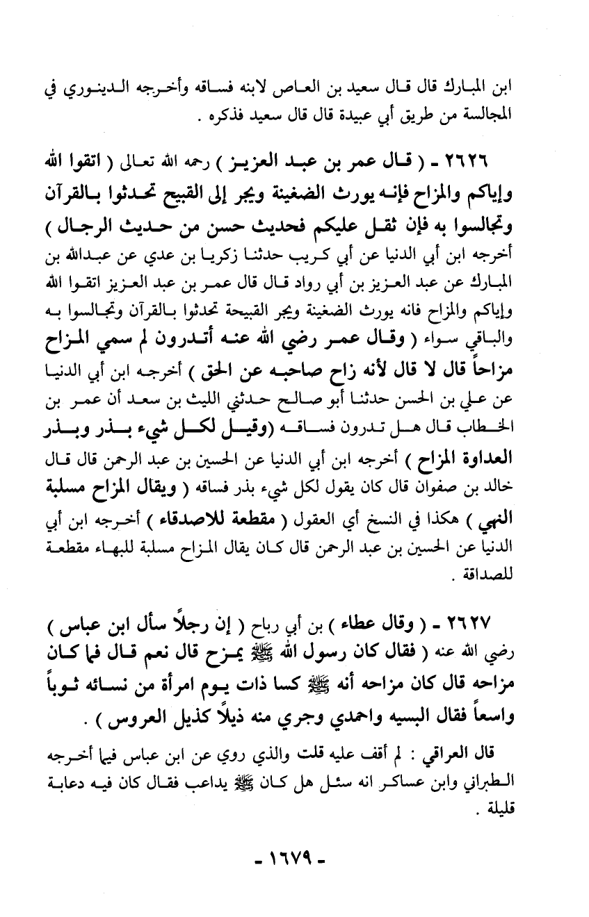 2626 - (قال عمر بن عبد العزيز) رحمه الله تعالى (اتقوا الله وإياكم والمزاح فإنه يورث الضغينة ويجر إلى القبيح تحدثوا بالقرآن وتجالسوا به فإن ثقل عليكم فحديث حسن من حديث الرجال) أخرجه ابن أبي الدنيا عن أبي كريب حدثنا زكريا بن عدي عن عبد الله بن المبارك عن عبد العزيز بن أبي رواد قال قال عمر بن عبد العزيز اتقوا الله وإياكم والمزاح فإنه يورث الضغينة ويجر القبيحة تحدثوا بالقرآن وتجالسوا به والباقي سواء (وقال عمر رضي الله عنه أتدرون لم سمي المزاح مزاحاً قال لا قال لأنه زاح صاحبه عن الحق) أخرجه ابن أبي الدنيا عن علي بن الحسن حدثنا أبو صالح حدثني الليث بن سعد أن عمر بن الخطاب قال هل تدرون فساقه (وقيل لكل شيء بذر وبذر العداوة المزاح) أخرجه ابن أبي الدنيا عن الحسين بن عبد الرحمن قال قال خالد بن صفوان قال كان يقول لكل شيء بذر فساقه (ويقال المزاح مسلبة النهي) هكذا في النسخ أي العقول (مقطعة للأصدقاء) أخرجه ابن أبي الدنيا عن الحسين بن عبد الرحمن قال كان يقال المزاح مسلبة للبهاء مقطعة للصداقة.