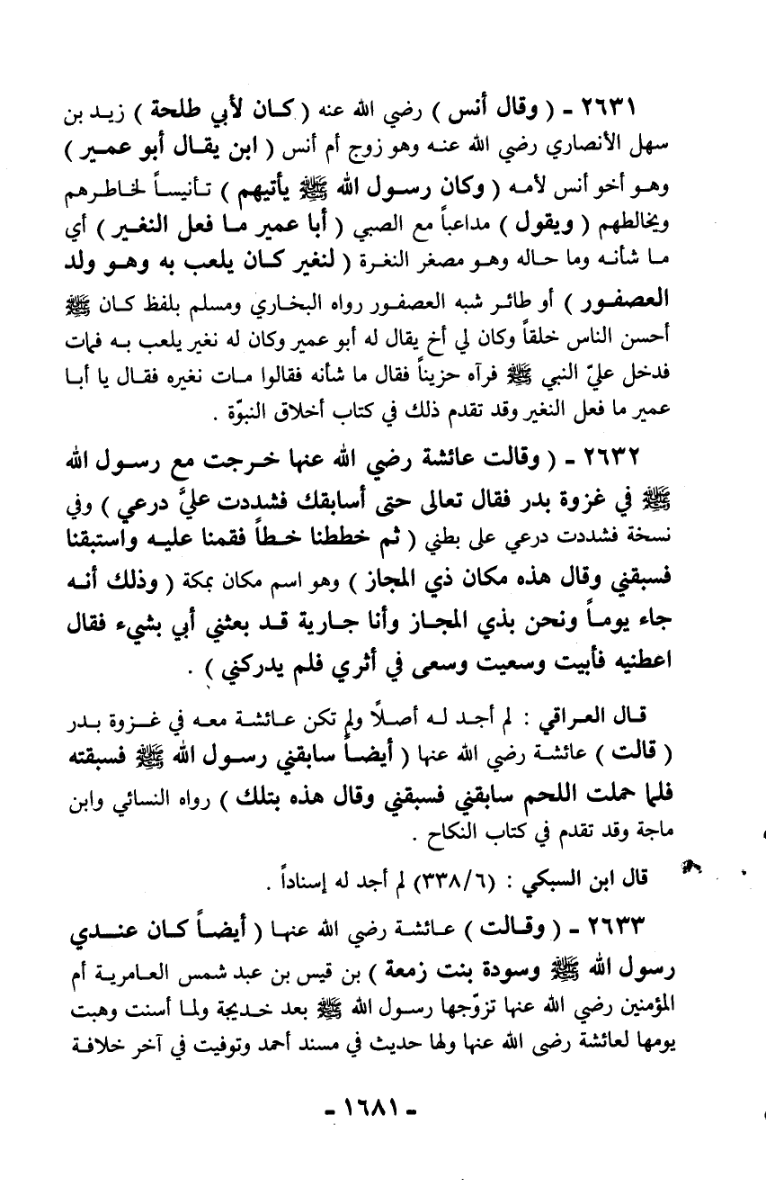 2632 - (وقالت عائشة رضي الله عنها خرجت مع رسول الله - صلّى الله عليه وسلم - في غزوة بدر فقال تعالى حتى أسابقك فشددت عليَّ درعي) وفي نسخة فشددت درعي على بطني (ثم خططنا خطاً فقمنا عليه واستبقنا فسبقني وقال هذه مكان ذي المجاز) وهو اسم مكان بمكة (وذلك أنه جاء يوماً ونحن بذي المجاز وأنا جارية قد بعثني أي بشيء فقال أعطنيه فأبيت وسعيت وسعى في أثري فلم يدركني).