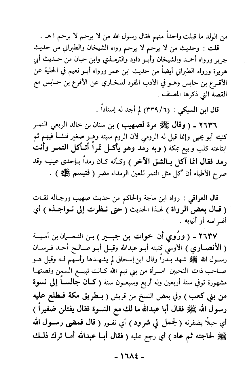 قلت: وحديث من لا يرحم لا يرحم رواه الشيخان والطبراني من حديث جرير ورواه أحمد والشيخان وأبو داود والترمذي وابن حبان من حديث أبي هريرة ورواه الطبراني أيضاً من حديث ابن عمر ورواه أبو نعيم في الحلية عن الأقرع بن حابس وهو في الأدب المفرد للبخاري عن الأقرع بن حابس مع القصة التي ذكرها المصنف.