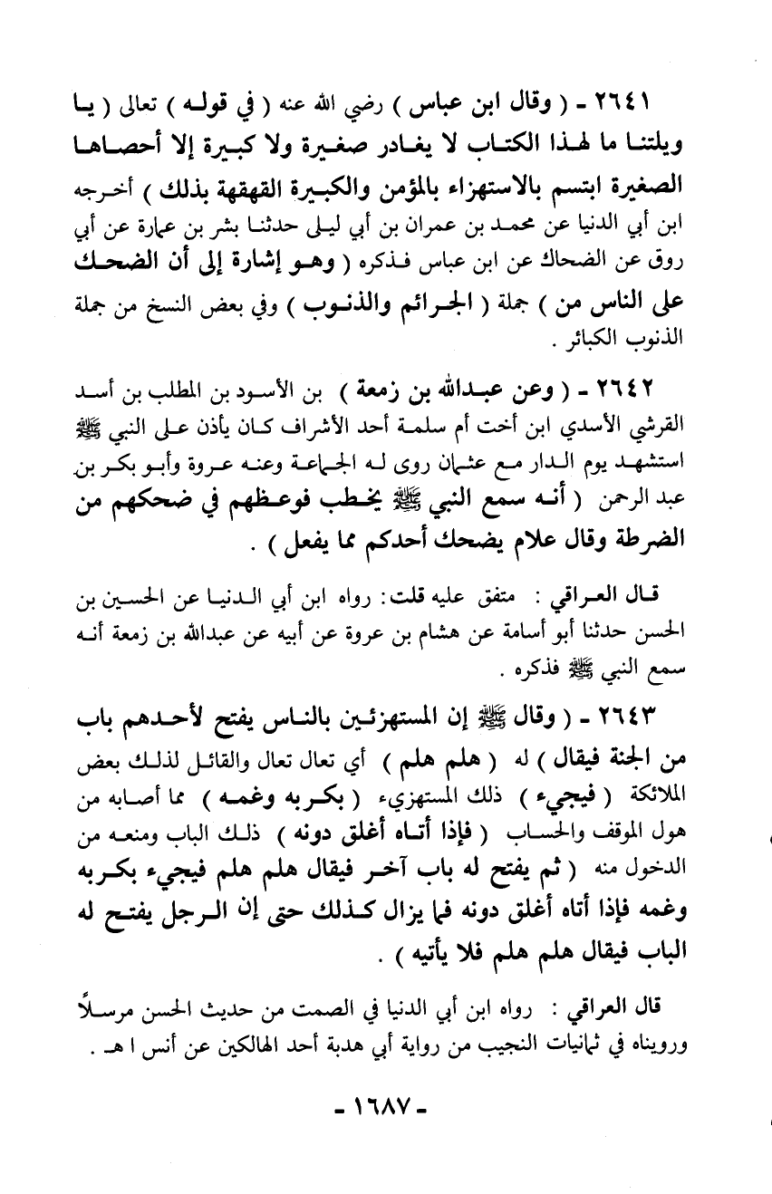 2641 - (وقال ابن عباس) رضي الله عنه (في قوله) تعالى (يا ويلتنا ما لهذا الكتاب لا يغادر صغيرة ولا كبيرة إلا أحصاها الصغيرة ابتسم بالاستهزاء بالمؤمن والكبيرة القهقهة بذلك) أخرجه ابن أبي الدنيا عن محمد بن عمران بن أبي ليلى حدثنا بشر بن عمارة عن أبي روق عن الضحاك عن ابن عباس فذكره (وهو إشارة إلى أن الضحك على الناس من) جملة (الجرائم والذنوب) وفي بعض النسخ من جملة الذنوب الكبائر.