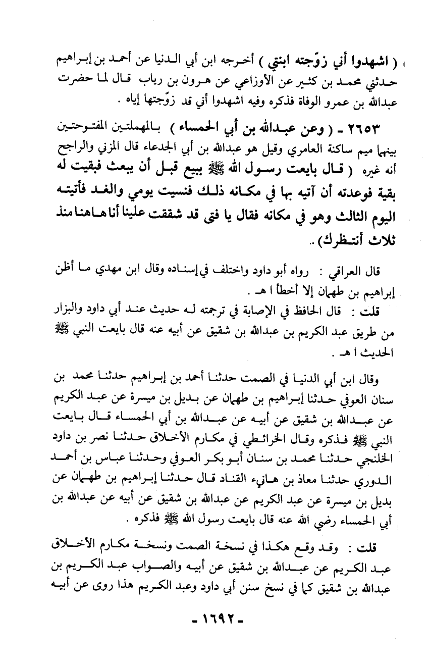 وقال ابن أبي الدنيا في الصمت حدثنا أحمد بن إبراهيم حدثنا محمد بن سنان العوفي حدثنا إبراهيم بن طهمان عن بديل بن ميسرة عن عبد الكريم عن عبد الله بن شقيق عن أبيه عن عبد الله بن أبي الحمساء قال بايعت النبي - صلّى الله عليه وسلم - فذكره وقال الخرائطي في مكارم الأخلاق حدثنا نصر بن داود الخلنجي حدثنا محمد بن سنان أبو بكر العوفي وحدثنا عباس بن أحمد الدوري حدثنا معاذ بن هانئ القناد قال حدثنا إبراهيم بن طهمان عن بديل بن ميسرة عن عبد الكريم عن عبد الله بن شقيق عن أبيه عن عبد الله بن أبي الحمساء رضي الله عنه قال بايعت رسول الله - صلّى الله عليه وسلم - فذكره.
