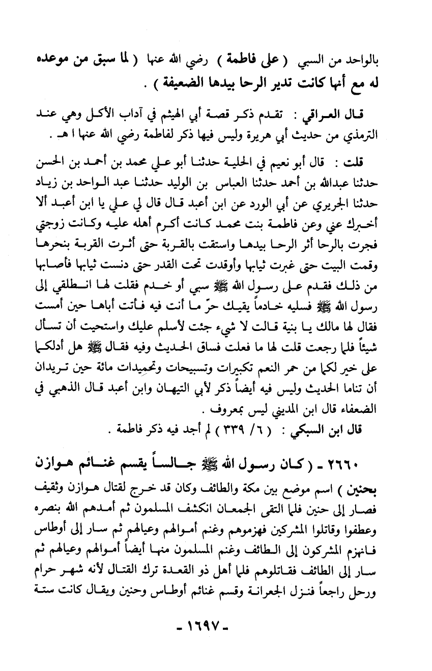 قلت: قال أبو نعيم في الحلية حدثنا أبو علي محمد بن أحمد بن الحسن حدثنا عبد الله بن أحمد حدثنا العباس بن الوليد حدثنا عبد الواحد بن زياد حدثنا الجريري عن أبي الورد عن ابن أعبد قال قال لي علي يا ابن أعبد ألا أخبرك عني وعن فاطمة بنت محمد كانت أكرم أهله عليه وكانت زوجتي فجرت بالرحا أثر الرحا بيدها واستقت بالقربة حتى أثرت القربة بنحرها وقمت البيت حتى غبرت ثيابها وأوقدت تحت القدر حتى دنست ثيابها فأصابها من ذلك فقدم على رسول الله - صلّى الله عليه وسلم - سبي أو خدم فقلت لها انطلقي إلى رسول الله - صلّى الله عليه وسلم - فسليه خادماً يقيك حرّ ما أنت فيه فأتت أباها حين أمست فقال لها مالك يا بنية قالت لا شيء جئت لأسلم عليك واستحيت أن تسأل شيئاً فلما رجعت قلت لها ما فعلت فساق الحديث وفيه فقال - صلّى الله عليه وسلم - هل أدلكما على خير لكما من حمر النعم تكبيرات وتسبيحات وتحميدات مائة حين تريدان أن تناما الحديث وليس فيه أيضاً ذكر لأبي التيهان وابن أعبد قال الذهبي في الضعفاء قال ابن المديني ليس بمعروف.
