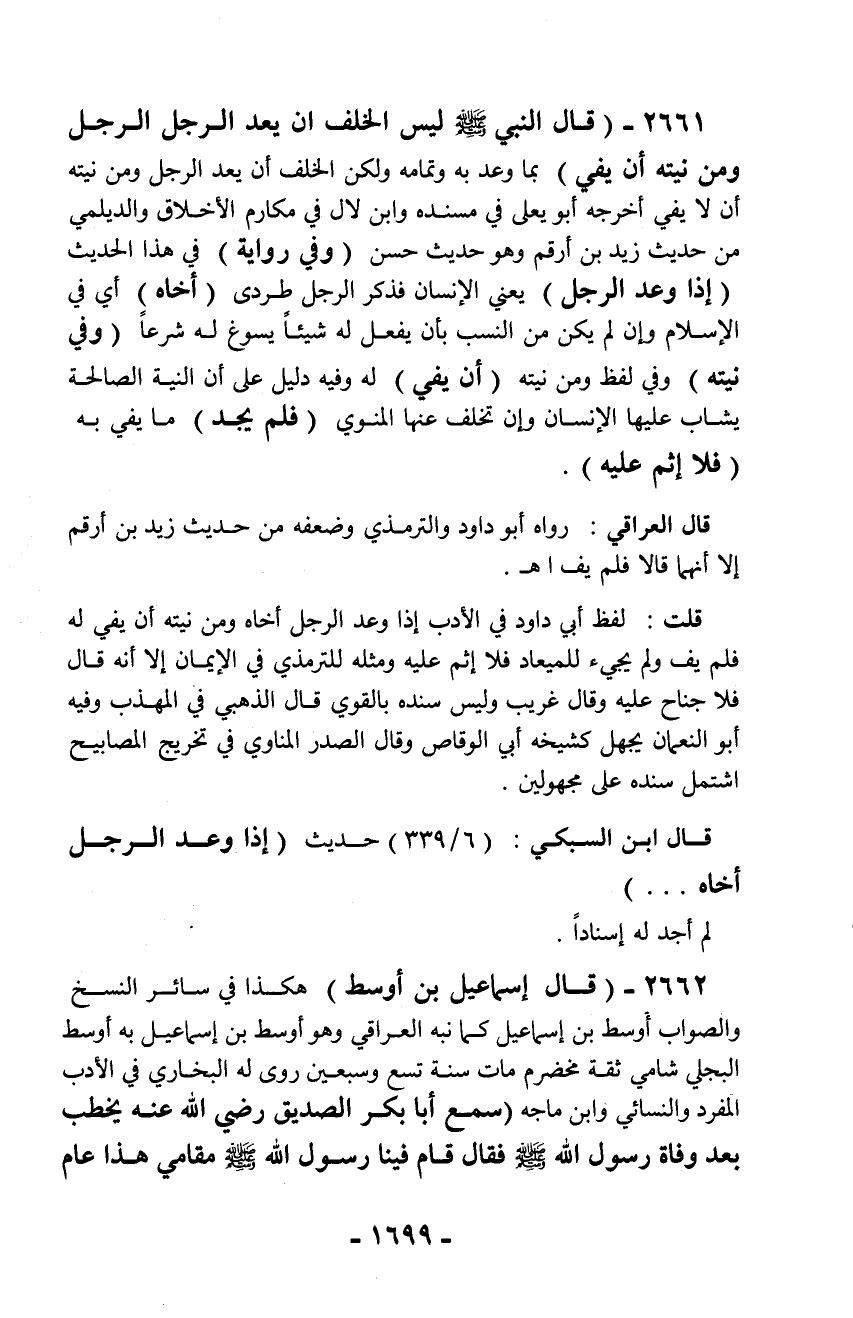 2661 - (قال النبي - صلّى الله عليه وسلم - ليس الخلف أن يعد الرجل الرجل ومن نيته أن يفي) بما وعد به وتمامه ولكن الخلف أن يعد الرجل ومن نيته أن لا يفي أخرجه أبو يعلى في مسنده وابن لال في مكارم الأخلاق والديلمي من حديث زيد بن أرقم وهو حديث حسن (وفي رواية) في هذا الحديث (إذا وعد الرجل) يعني الإنسان فذكر الرجل طردى (أخاه) أي في الإسلام وإن لم يكن من النسب بأن يفعل له شيئاً يسوغ له شرعاً (وفي نيته) وفي لفظ ومن نيته (أن يفي) له وفيه دليل على أن النية الصالحة يشاب عليها الإنسان وإن تخلف عنها المنوي (فلم يجد) ما يفي به (فلا إثم عليه).