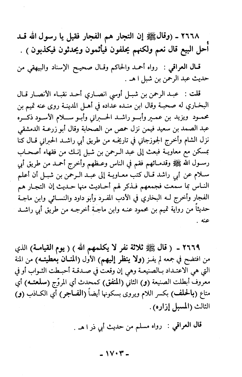 2668 - (وقال - صلّى الله عليه وسلم - إن التجار هم الفجار فقيل يا رسول الله قد أحل البيع قال نعم ولكنهم يحلفون فيأثمون ويحدثون فيكذبون).