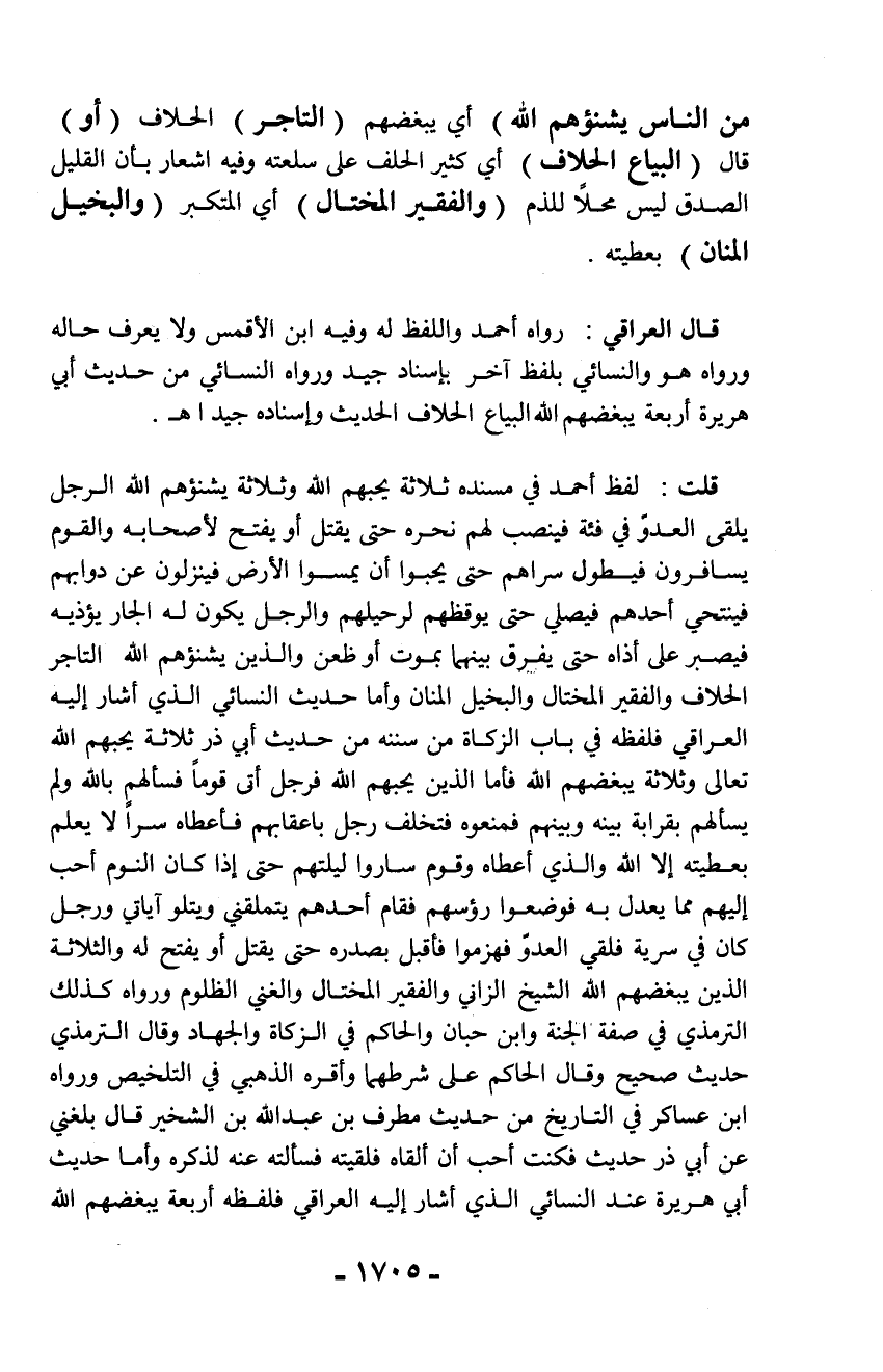 قلت: لفظ أحمد في مسنده ثلاثة يحبهم الله وثلاثة يشنؤهم الله الرجل يلقى العدوّ في فئة فينصب لهم نحره حتى يقتل أو يفتح لأصحابه والقوم يسافرون فيطول سراهم حتى يحبوا أن يمسوا الأرض فينزلون عن دوابهم فينتحي أحدهم فيصلي حتى يوقظهم لرحيلهم والرجل يكون له الجار يؤذيه فيصبر على أذاه حتى يفرق بينهما بموت أو ظعن والذين يشنؤهم الله التاجر الحلاف والفقير المختال والبخيل المنان وأما حديث النسائي الذي أشار إليه العراقي فلفظه في باب الزكاة من سننه من حديث أبي ذر ثلاثة يحبهم الله تعالى وثلاثة يبغضهم الله فأما الذين يحبهم الله فرجل أتى قوماً فسألهم بالله ولم يسألهم بقرابة بينه وبينهم فمنعوه فتخلف رجل بأعقابهم فأعطاه سراً لا يعلم بعطيته إلا الله والذي أعطاه وقوم ساروا ليلتهم حتى إذا كان النوم أحب إليهم مما يعدل به فوضعوا رؤسهم فقام أحدهم يتملقني ويتلو آياتي ورجل كان في سرية فلقي العدوّ فهزموا فأقبل بصدره حتى يقتل أو يفتح له والثلاثة الذين يبغضهم الله الشيخ الزاني والفقير المختال والغني الظلوم ورواه كذلك الترمذي في صفة الجنة وابن حبان والحاكم في الزكاة والجهاد وقال الترمذي حديث صحيح وقال الحاكم على شرطهما وأقره الذهبي في التلخيص ورواه ابن عساكر في التاريخ من حديث مطرف بن عبد الله بن الشخير قال بلغني عن أبي ذر حديث فكنت أحب أن ألقاه فلقيته فسألته عنه لذكره وأما حديث أبي هريرة عند النسائي الذي أشار إليه العراقي فلفظه أربعة يبغضهم الله