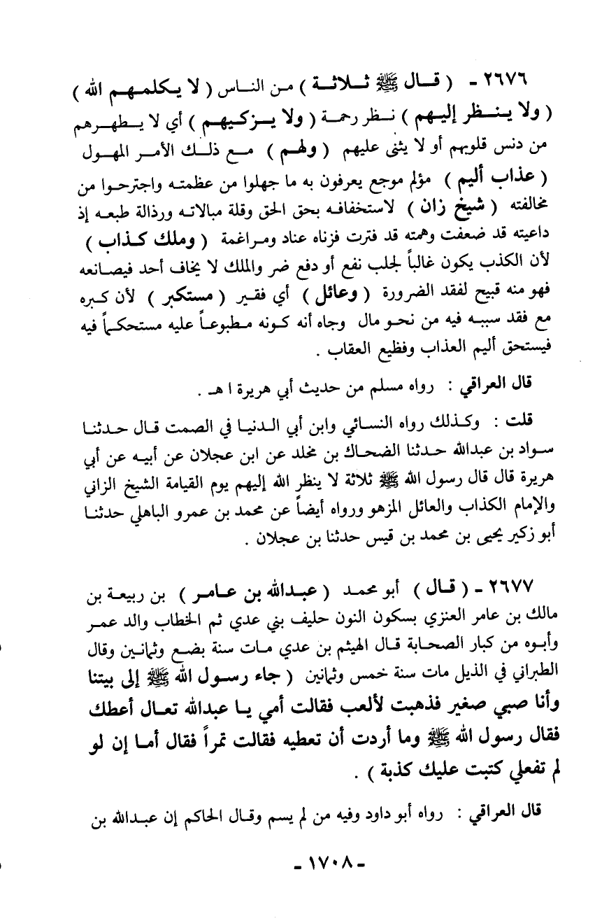 2676 - (قال - صلّى الله عليه وسلم - ثلاثة) من الناس (لا يكلمهم الله) (ولا ينظر إليهم) نظر رحمة (ولا يزكيهم) أي لا يطهرهم من دنس قلوبهم أو لا يثنى عليهم (ولهم) مع ذلك الأمر المهول (عذاب أليم) مؤلم موجع يعرفون به ما جهلوا من عظمته واجترحوا من مخالفته (شيخ زان) لاستخفافه بحق الحق وقلة مبالاته ورذالة طبعه إذ داعيته قد ضعفت وهمته قد فترت فزناه عناد ومراغمة (وملك كذاب) لأن الكذب يكون غالباً لجلب نفع أودفع ضر والملك لا يخاف أحد فيصانعه فهو منه قبيح لفقد الضرورة (وعائل) أي فقير (مستكبر) لأن كبره مع فقد سببه فيه من نحو مال وجاه أنه كونه مطبوعاً عليه مستحكماً فيه فيستحق أليم العذاب وفظيع العقاب.