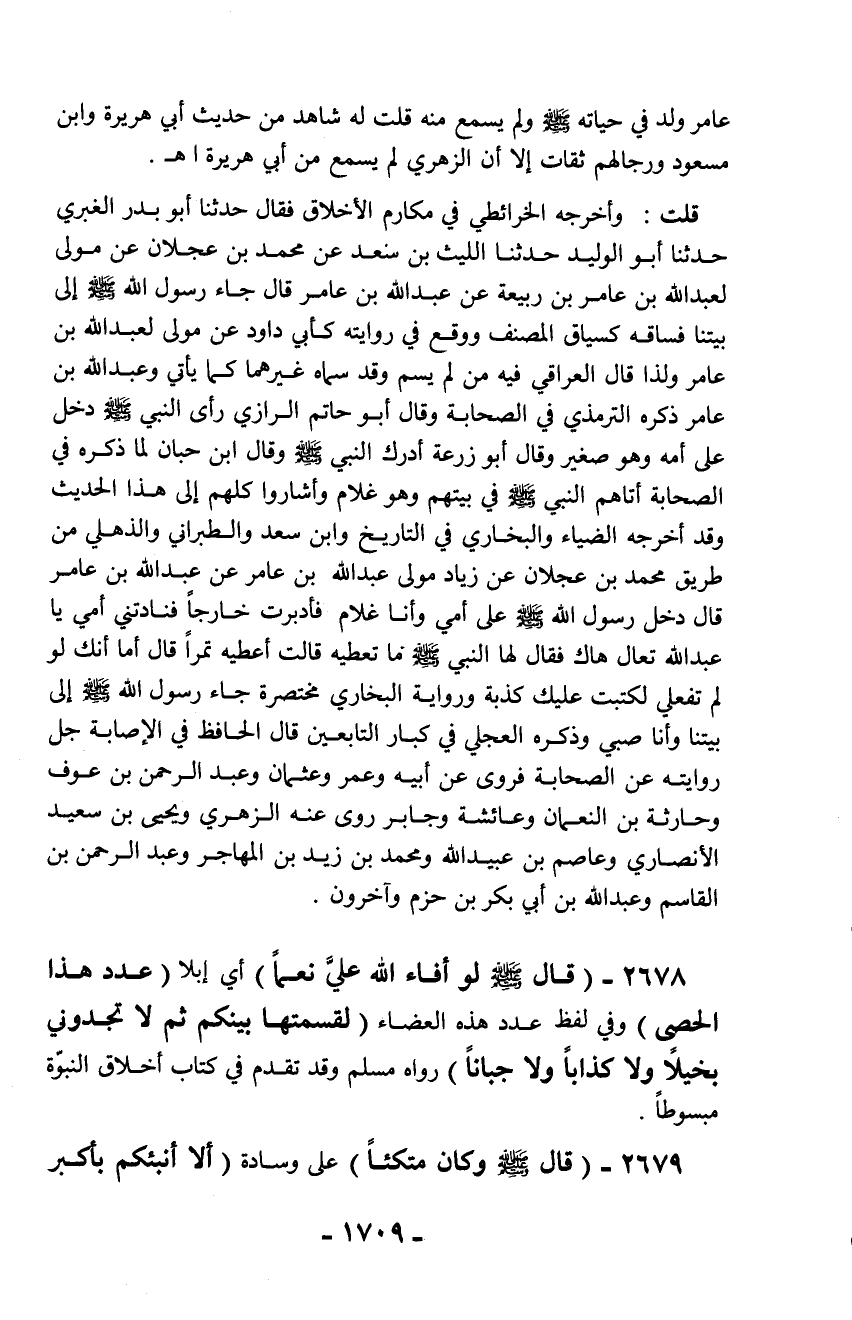 عامر ولد في حياته - صلّى الله عليه وسلم - ولم يسمع منه قلت له شاهد من حديث أبي هريرة وابن مسعود ورجالهم ثقات إلا أن الزهري لم يسمع من أبي هريرة اهـ.