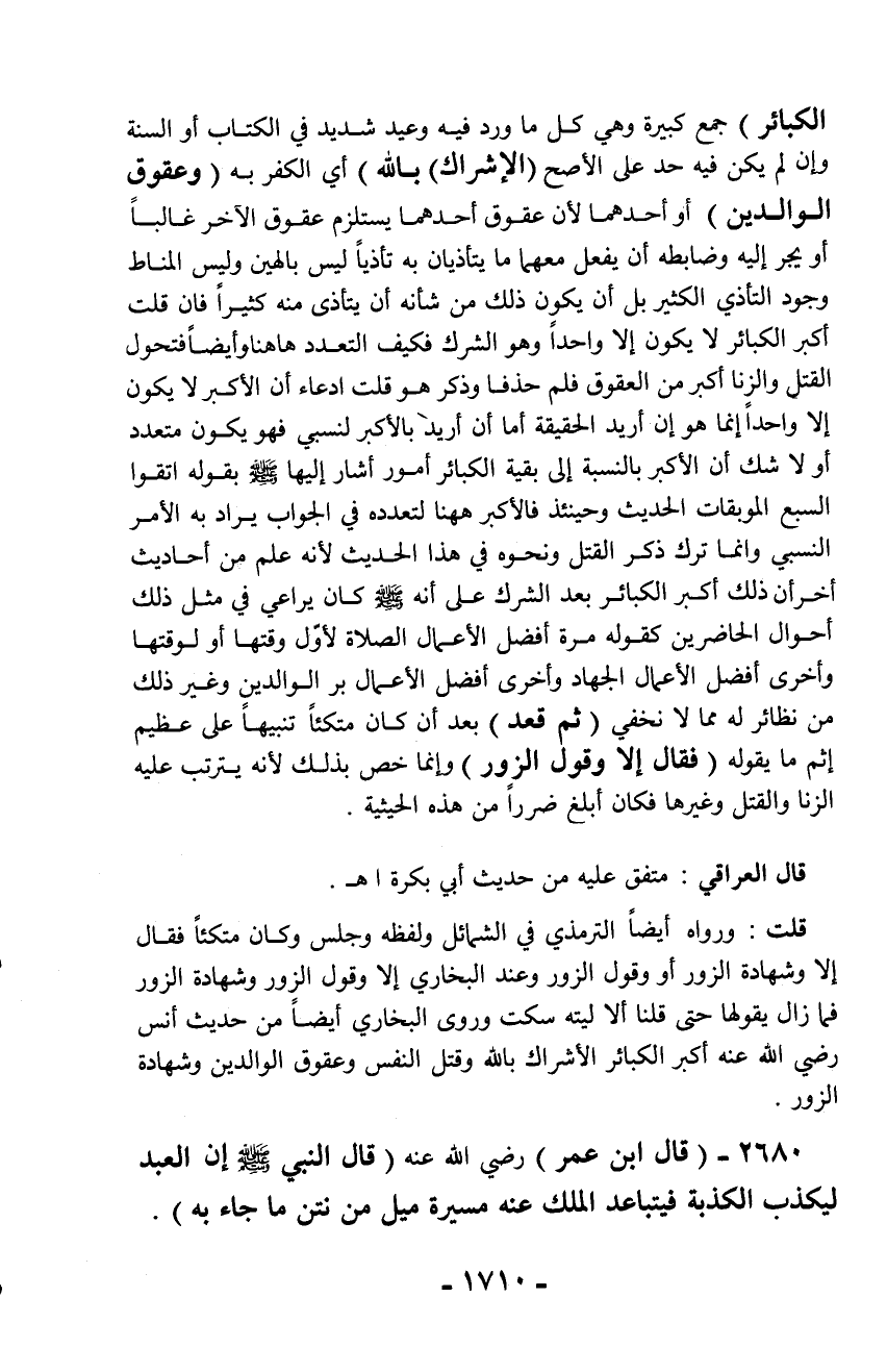 الكبائر) جمع كبيرة وهي كل ما ورد فيه وعيد شديد في الكتاب أو السنة وإن لم يكن فيه حد على الأصح (الإشراك) بالله) أي الكفر به (وعقوق الوالدين) أو أحدهما لأن عقوق أحدهما يستلزم عقوق الآخر غالباً أو يجر إليه وضابطه أن يفعل معهما ما يتأذيان به تأذياً ليس بالهين وليس المناط وجود التأذي الكثير بل أن يكون ذلك من شأنه أن يتأذى منه كثيراً فإن قلت أكبر الكبائر لا يكون إلا واحداً وهو الشرك فكيف التعدد هاهنا وأيضاً فتحول القتل والزنا أكبر من العقوق فلم حذفا وذكر هو قلت ادعاء أن الأكبر لا يكون إلا واحداً إنما هو إن أريد الحقيقة أما أن أريد بالأكبر لنسبي فهو يكون متعدد أو لا شك أن الأكبر بالنسبة إلى بقية الكبائر أمور أشار إليها - صلّى الله عليه وسلم - بقوله اتقوا السبع الموبقات الحديث وحينئذ فالأكبر هاهنا لتعدده في الجواب يراد به الأمر النسبي وإنما ترك ذكر القتل ونحوه في هذا الحديث لأنه علم من أحاديث أخر أن ذلك أكبر الكبائر بعد الشرك على أنه - صلّى الله عليه وسلم - كان يراعي في مثل ذلك أحوال الحاضرين كقوله مرة أفضل الأعمال الصلاة لأوّل وقتها أو لوقتها وأخرى أفضل الأعمال الجهاد وأخرى أفضل الأعمال بر الوالدين وغير ذلك من نظائر له مما لا نخفي (ثم قعد) بعد أن كان متكئاً تنبيهاً على عظيم إثم ما يقوله (فقال ألا وقول الزور) وإنما خص بذلك لأنه يترتب عليه الزنا والقتل وغيرها فكان أبلغ ضرراً من هذه الحيثية.