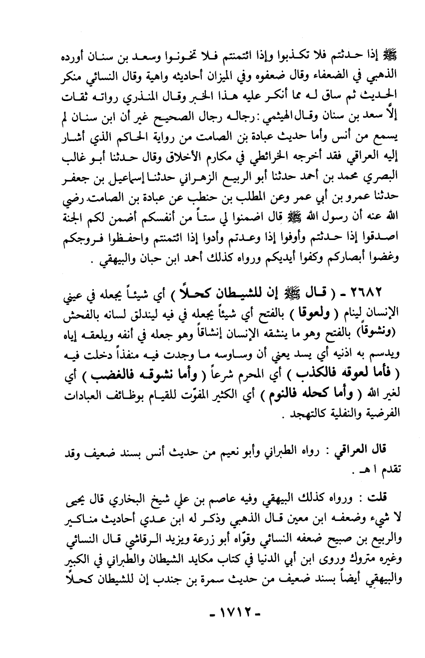 2682 - (قال - صلّى الله عليه وسلم - إن للشيطان كحلاً) أي شيئاً يجعله في عيني الإنسان لينام (ولعوقا) بالفتح أي شيئاً يجعله في فيه ليندلق لسانه بالفحش (ونشوقاً) بالفتح وهو مما ينشقه الإنسان إنشاقاً وهو جعله في أنفه ويلعقه إياه ويدسم به أذنيه أي يسد يعني أن وساوسه ما وجدت فيه منفذاً دخلت فيه (فأما لعوقه فالكذب) أي المحرم شرعاً (وأما نشوقه فالغضب) أي لغير الله (وأما كحله فالنوم) أي الكثير المفوّت للقيام بوظائف العبادات الفرضية والنفلية كالتهجد.