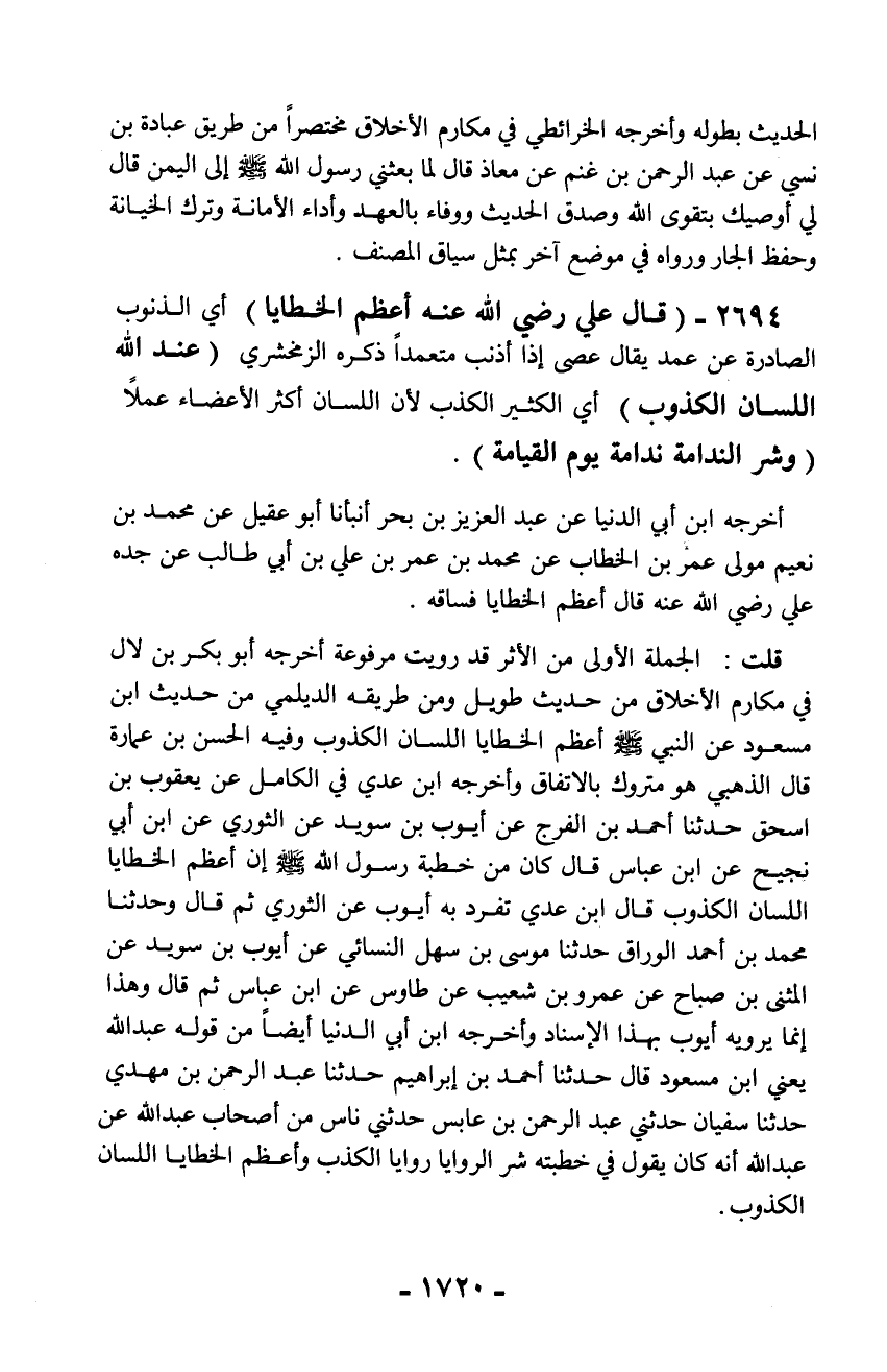 قلت: الجملة الأولى من الأثر قد رويت مرفوعة أخرجه أبو بكر بن لال في مكارم الأخلاق من حديث طويل ومن طريقه الديلمي من حديث ابن مسعود عن النبي - صلّى الله عليه وسلم - أعظم الخطايا اللسان الكذوب وفيه الحسن بن عمارة قال الذهبي هو متروك بالاتفاق وأخرجه ابن عدي في الكامل عن يعقوب بن إسحاق حدثنا أحمد بن الفرج عن أيوب بن سويد عن الثوري عن ابن أبي نجيح عن ابن عباس قال كان من خطبة رسول الله - صلّى الله عليه وسلم - إن أعظم الخطايا اللسان الكذوب قال ابن عدي تفرد به أيوب عن الثوري ثم قال وحدثنا محمد بن أحمد الوراق حدثنا موسى بن سهل النسائي عن أيوب بن سويد عن المثنى بن صباح عن عمرو بن شعيب عن طاوس عن ابن عباس ثم قال وهذا إنما يرويه أيوب بهذا الإسناد وأخرجه ابن أبي الدنيا أيضاً من قوله عبد الله يعني ابن مسعود قال حدثنا أحمد بن إبراهيم حدثنا عبد الرحمن بن مهدي حدثنا سفيان حدثني عبد الرحمن بن عابس حدثني ناس من أصحاب عبد الله عن عبد الله أنه كان يقول في خطبته شر الروايا روايا الكذب وأعظم الخطايا اللسان الكذوب.