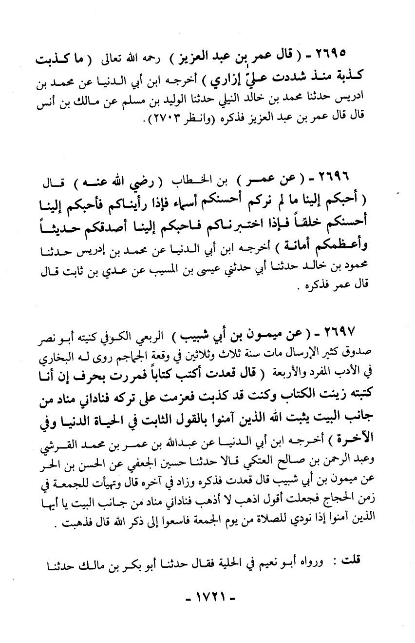 2697 - (عن ميمون بن أبي شبيب) الربعي الكوفي كنيته أبو نصر صدوق كثير الإرسال مات سنة ثلاث وثلاثين في وقعة الجماجم روى له البخاري في الأدب المفرد والأربعة (قال قعدت أكتب كتاباً فمررت بحرف إن أنا كتبته زينت الكتاب وكنت قد كذبت فعزمت على تركه فناداني مناد من جانب البيت يثبت الله الذين آمنوا بالقول الثابت في الحياة الدنيا وفي الآخرة) أخرجه ابن أبي الدنيا عن عبد الله بن عمر بن محمد القرشي وعبد الرحمن بن صالح العتكي قالا حدثنا حسين الجعفي عن الحسن بن الحر عن ميمون بن أبي شبيب قال قعدت فذكره وزاد في آخره قال وتهيأت للجمعة في زمن الحجاج فجعلت أقول اذهب لا أذهب فناداني مناد من جانب البيت يا أيها الذين آمنوا إذا نودي للصلاة من يوم الجمعة فاسعوا إلى ذكر الله قال فذهبت.