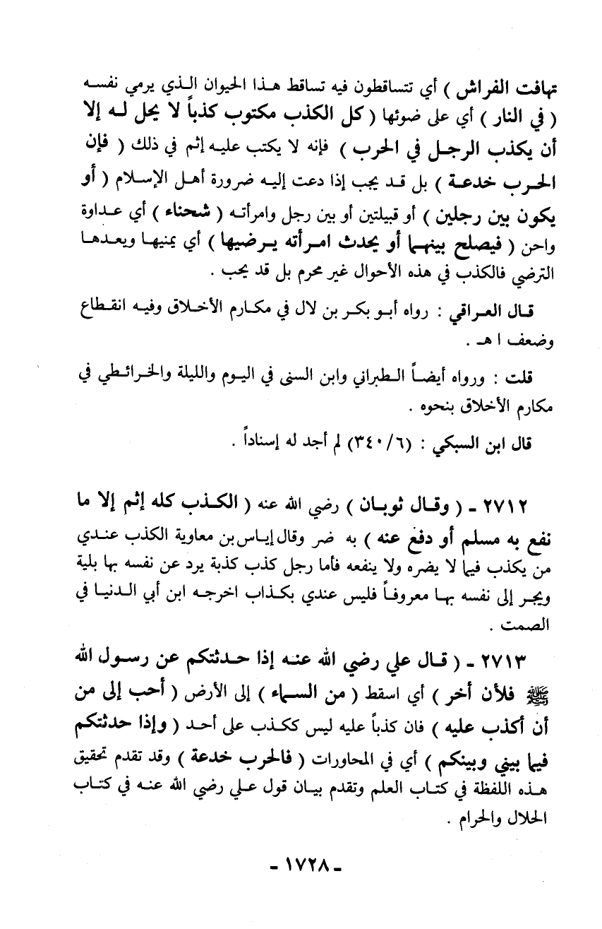 2712 - (وقال ثوبان) رضي الله عنه (الكذب كله إثم إلا ما نفع به مسلم أو دفع عنه) به ضر وقال إياس بن معاوية الكذب عندي من يكذب فيما لا يضره ولا ينفعه فأما رجل كذب كذبة يرد عن نفسه بها بلية ويجر إلى نفسه بها معروفاً فليس عندي بكذاب أخرجه ابن أبي الدنيا في الصمت.