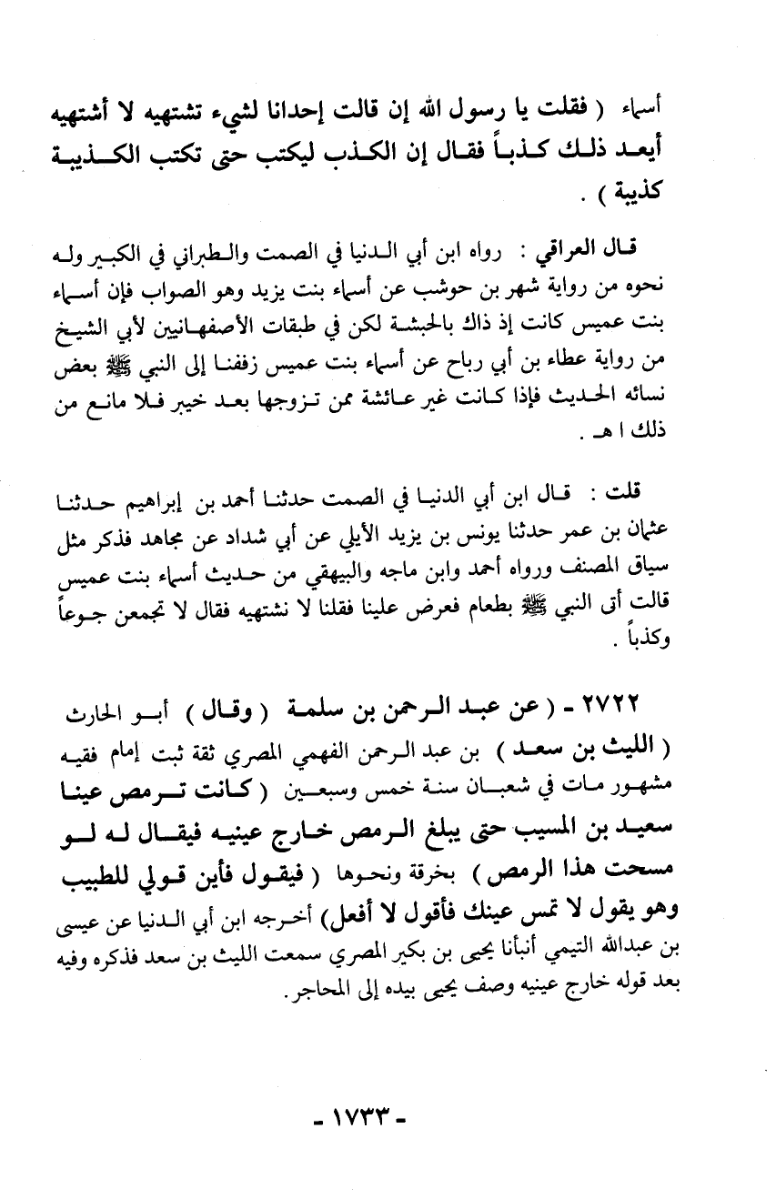 أسماء (فقلت يا رسول الله إن قالت إحدانا لشيء تشتهيه لا أشتهيه أيعد ذلك كذباً فقال إن الكذب ليكتب حتى تكتب الكذيبة كذيبة).