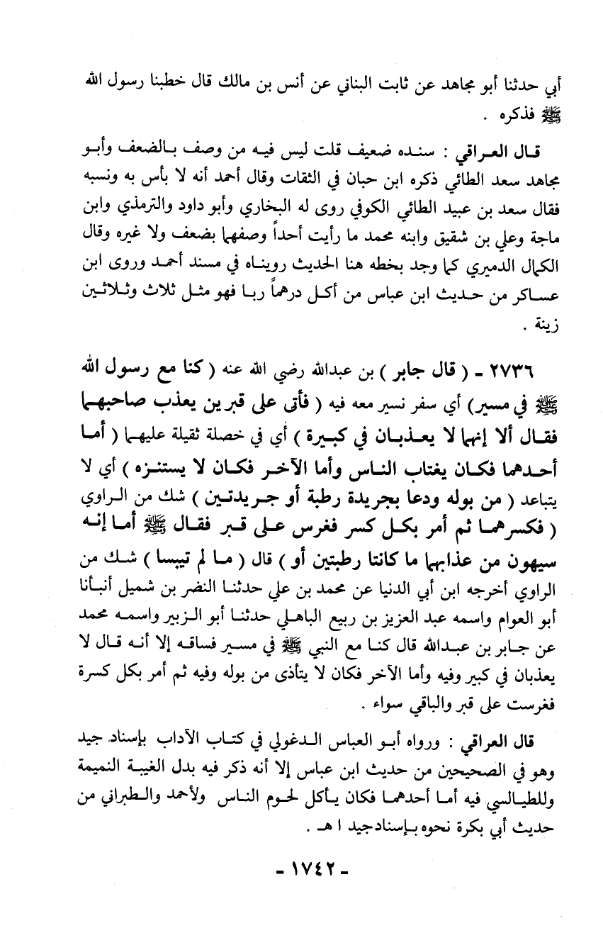 قال العراقي: ورواه أبو العباس الدغولي في كتاب الآداب بإسناد جيد وهو في الصحيحين من حديث ابن عباس إلا أنه ذكر فيه بدل الغيبة النميمة وللطيالسي فيه أما أحدهما فكان يأكل لحوم الناس ولأحمد والطبراني من حديث أبي بكرة نحوه بإسناد جيد اهـ.