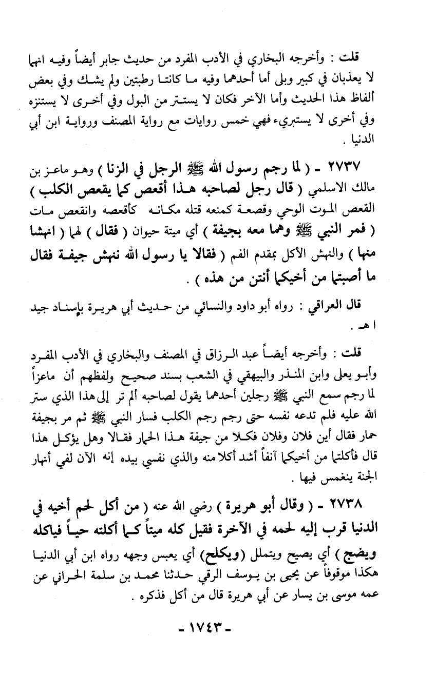 قلت: وأخرجه أيضاً عبد الرزاق في المصنف والبخاري في الأدب المفرد وأبو يعلى وابن المنذر والبيهقي في الشعب بسند صحيح ولفظ أن ماعزاً لما رجم سمع النبي - صلّى الله عليه وسلم - رجلين أحدهما يقول لصاحبه ألم تر إلى هذا الذي ستر الله عليه فلم تدعه نفسه حتى رجم رجم الكلب فسار النبي - صلّى الله عليه وسلم - ثم مر بجيفة حمار فقال أين فلان وفلان فكلا من جيفة هذا الحمار فقالا وهل يؤكل هذا قال فأكلتما من أخيكما آنفاً أشد أكلا منه والذي نفسي بيده إنه الآن لفي أنهار الجنة ينغمس فيها.
