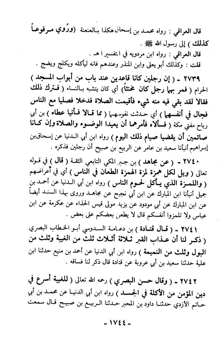 2740 - (عن مجاهد) بن جبر المكي التابعي الثقة (قال) في قوله تعالى (ويل لكل همزة لمزة الهمزة الطعان في الناس) أي في أعراضهم (واللمزة الذي يأكل لحوم الناس) رواه ابن أبي الدنيا عن أحمد بن جميل أنبأنا ابن المبارك عن ابن أبي نجيح عن مجاهد وروى بهذا السند أيضاً عن ابن المبارك عن أبي مودود عن يزيد مولى قيس الحذاء عن عكرمة عن ابن عباس ولا تلمزوا أنفسكم قال لا يطعن بعضكم على بعض.