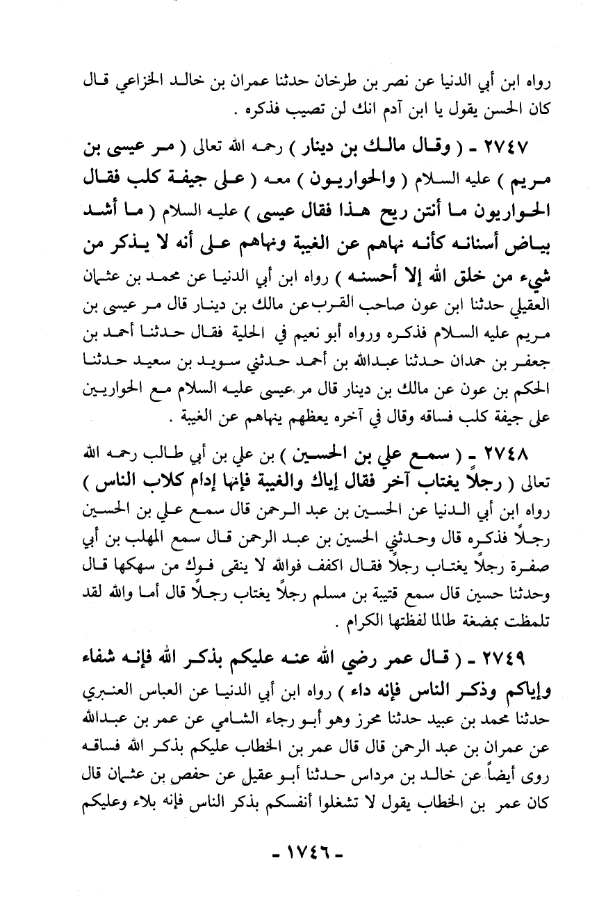 2748 - (سمع علي بن الحسين) بن علي بن أبي طالب رحمه الله تعالى (رجلاً يغتاب آخر فقال إياك والغيبة فإنها إدام كلاب الناس) رواه ابن أبي الدنيا عن الحسين بن عبد الرحمن قال سمع علي بن الحسين رجلاً فذكره قال وحدثني الحسين بن عبد الرحمن قال سمع المهلب بن أبي صفرة رجلاً يغتاب رجلاً فقال اكفف فوالله لا ينقى فوك من سهكها قال وحدثنا حسين قال سمع قتيبة بن مسلم رجلاً يغتاب رجلاً قال أما والله لقد تلمظت بمضغة طالما لفظتها الكرام.