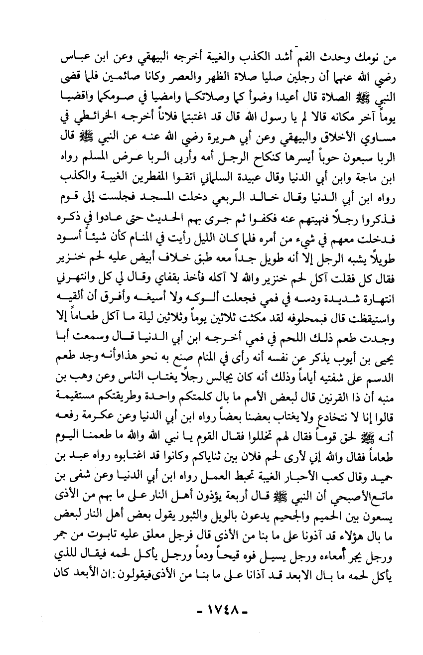 من نومك وحدث الفم أشد الكذب والغيبة أخرجه البيهقي وعن ابن عباس رضي الله عنهما أن رجلين صليا صلاة الظهر والعصر وكانا صائمين فلما قضى النبي - صلّى الله عليه وسلم - الصلاة قال أعيدا وضوأ كما وصلاتكما وامضيا في صومكما واقضيا يوماً آخر مكانه قالا لم يا رسول الله قال قد اغتبتما فلاناً أخرجه الخرائطي في مساوي الأخلاق والبيهقي وعن أبي هريرة رضي الله عنه عن النبي - صلّى الله عليه وسلم - قال الربا سبعون حوباً أيسرها كنكاح الرجل أمه وأربى الربا عرض المسلم رواد ابن ماجة وابن أبي الدنيا وقال عبيدة السلماني اتقوا المفطرين الغيبة والكذب رواه ابن أبي الدنيا وقال خالد الربعي دخلت المسجد فجلست إلى قوم فذكروا رجلاً فنهيتهم عنه فكفوا ثم جرى بهم الحديث حتى عادوا في ذكره فدخلت معهم في شيء من أمره فلما كان الليل رأيت في المنام كأن شيئاً أسود طويلاً يشبه الرجل إلا أنه طويل جداً معه طبق خلاف أبيض عليه لحم خنزير فقال كل فقلت آكل لحم خنزير والله لا آكله فأخذ بقفاي وقال لي كل وانتهرني انتهارة شديدة ودسه في فمي فجعلت ألوكه ولا أسيغه وأفرق أن ألقيه واستيقظت قال فبمحلوفه لقد مكثت ثلاثين يوماً وثلاثين ليلة ما آكل طعاماً إلا وجدت طعم ذلك اللحم في فمي أخرجه ابن أبي الدنيا قال وسمعت أبا يحيى بن أيوب يذكر عن نفسه أنه رأى في المنام صنع به نحو هذا وأنه وجد طعم الدسم على شفتيه أياماً وذلك أنه كان يجالس رجلاً يغتاب الناس وعن وهب بن منبه أن ذا القرنين قال لبعض الأمم ما بال كلمتكم واحدة وطريقتكم مستقيمة قالوا إنا لا نتخادع ولا يغتاب بعضنا بعضاً رواه ابن أبي الدنيا وعن عكرمة رفعه أنه - صلّى الله عليه وسلم - قوماً فقال لهم تخللوا فقال القوم يا نبي الله والله ما طعمنا اليوم طعاماً فقال والله إني لأرى لحم فلان بين ثناياكم وكانوا قد اغتابوه رواه عبد بن حميد وقال كعب الأحبار الغيبة تحبط العمل رواه ابن أبي الدنيا وعن شفى بن ماتع الأصبحي أن النبي - صلّى الله عليه وسلم - قال أربعة يؤذون أهل النار على ما بهم من الأذى يسعون بين الحميم والجحيم يدعون بالويل والثبور يقول بعض أهل النار لبعض ما بال هؤلاء قد آذونا على ما بنا من الأذى قال فرجل معلق عليه تابوت من جمر ورجل يجر أمعاءه ورجل يسيل فوه قيحاً ودماً ورجل يأكل لحمه فيقال للذي يأكل لحمه ما بال الأبعد قد آذانا على ما بنا من الأذى فيقولون: أن الأبعد كان