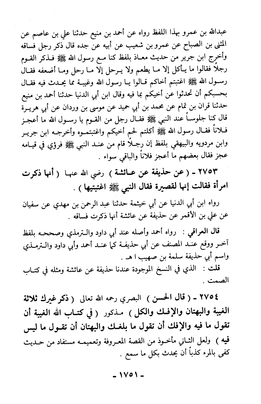 2753 - (عن حذيفة عن عائشة) رضي الله عنها (أنها ذكرت امرأة فقالت إنها لقصيرة فقال النبي - صلّى الله عليه وسلم - اغتبتيها).