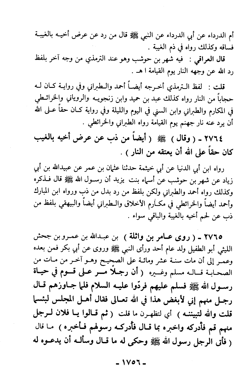 2764 - (وقال) - صلّى الله عليه وسلم - (أيضاً من ذب عن عرض أخيه بالغيب كان حقاً على الله أن يعتقه من النار).