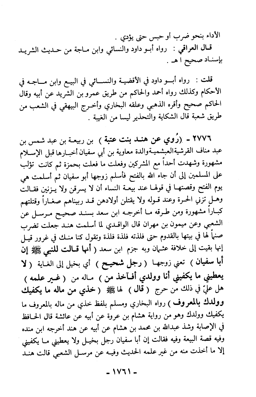 2776 - (رُوي عن هند بنت عتبة) بن ربيعة بن عبد شمس بن عبد مناف القرشية العبشمية والدة معاوية بن أبي سفيان أخبارها قبل الإسلام مشهورة وشهدت أحداً مع المشركين وفعلت ما فعلت بحمزة ثم كانت تؤلب على المسلمين إلى أن جاء الله بالفتح فأسلم زوجها أبو سفيان ثم أسلمت هي يوم الفتح وقصتها في قولها عند بيعة النساء أن لا يسرقن ولا يزنين فقالت وهل تزني الحرة وعند قوله ولا يقتلن أولادهن قد ربيناهم صغاراً وقتلتهم كباراً مشهورة ومن طرقه ما أخرجه ابن سعد بسند صحيح مرسل عن الشعبي وعن ميمون بن مهران قال الواقدي لما أسلمت هند جعلت تضرب صنماً لها في بيتها بالقدوم حتى فلذته فلذة فلذة وتقول كنا منك في غرور قيل إنها بقيت إلى خلافة عثمان وبه جزم ابن سعد (أنها قالت للنبي - صلّى الله عليه وسلم - إن أبا سفيان) تعني زوجها (رجل شحيح) أي بخيل إلى الغاية (لا يعطيني ما يكفيني أنا وولدي أفآخذ من) ماله من (غير علمه) هل عليّ في ذلك من حرج (قال) لها - صلّى الله عليه وسلم - (خذي من ماله ما يكفيك وولدك بالمعروف) رواه البخاري ومسلم بلفظ خذي من ماله بالمعروف ما يكفيك وولدك وهو من رواية هشام بن عروة عن أبيه عن عائشة قال الحافظ في الإصابة وشذ عبد الله بن محمد بن هشام عن أبيه عن هند أخرجه ابن منده وفيه قصة البيعة وفيه فقالت إن أبا سفيان رجل بخيل ولا يعطيني ما يكفيني إلا ما أخذت منه من غير علمه الحديث وفيه عن مرسل الشعبي قالت هند