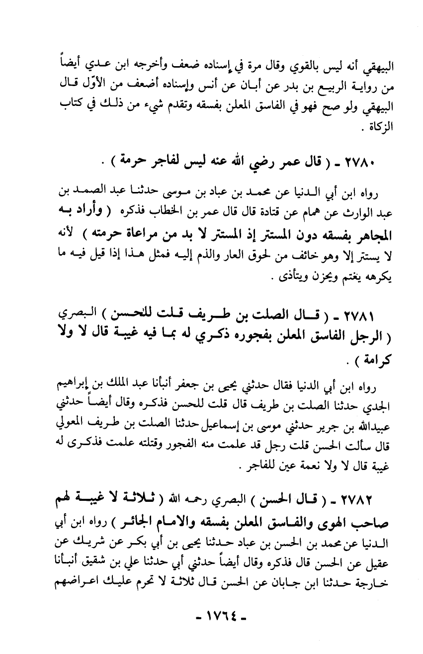 2781 - (قال الصلت بن طريف قلت للحسن) البصري (الرجل الفاسق المعلن بفجوره ذكري له بما فيه غيبة قال لا ولا كرامة).