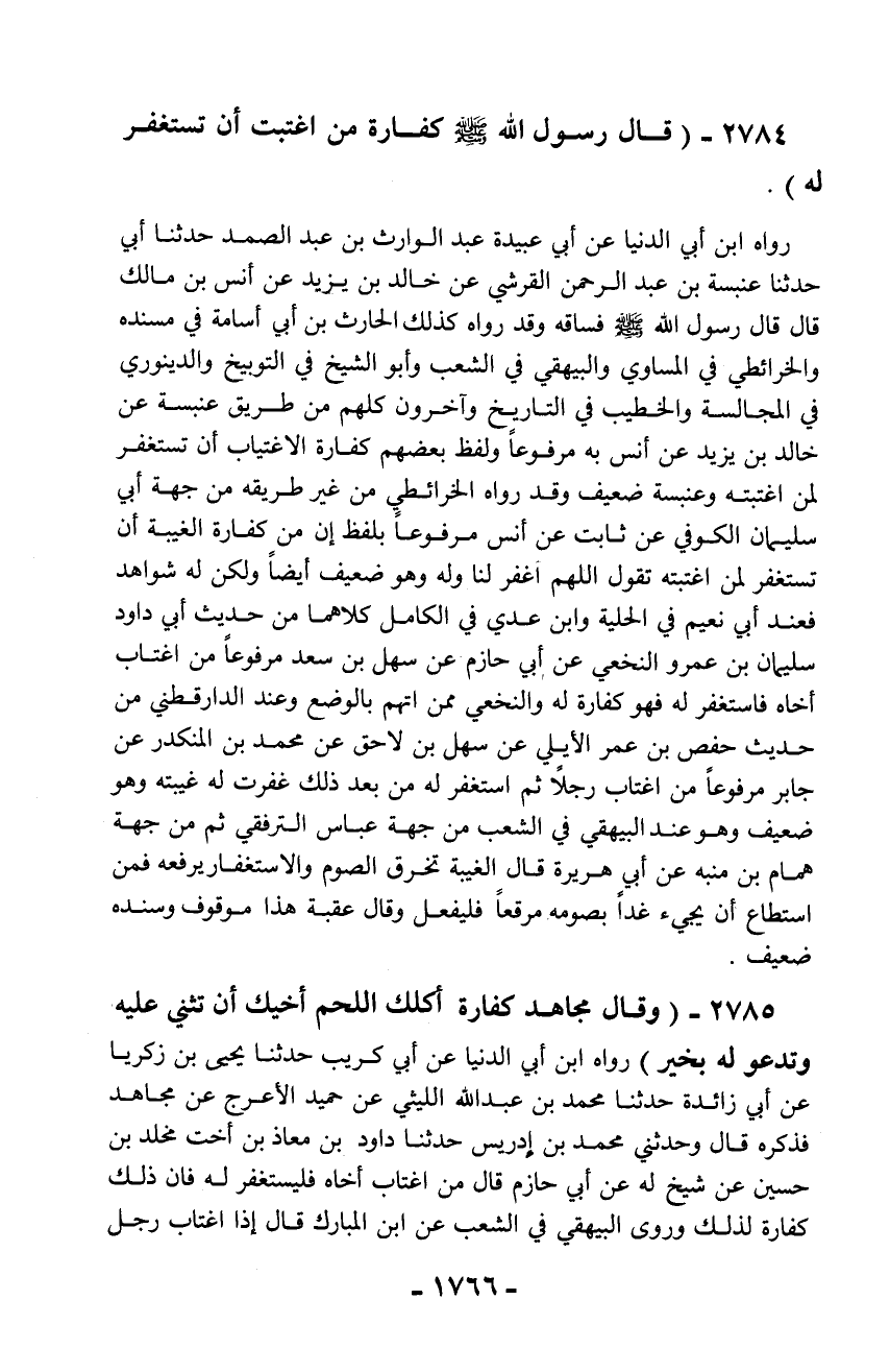 2784 - (قال رسول الله - صلّى الله عليه وسلم - كفارة من اغتبت أن تستغفر له).