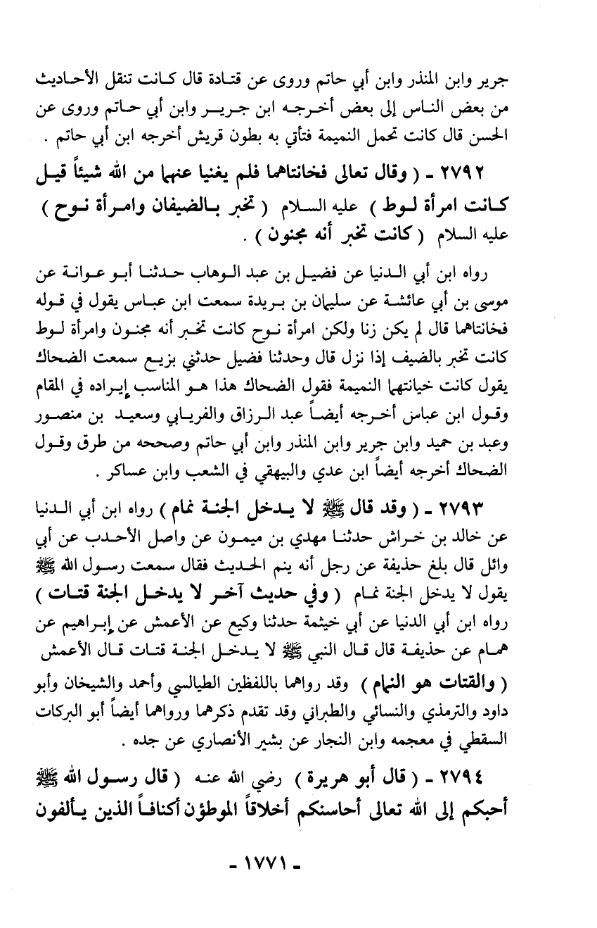 2793 - (وقد قال - صلّى الله عليه وسلم - لا يدخل الجنة نمام) رواه ابن أبي الدنيا عن خالد بن خراش حدثنا مهدي بن ميمون عن واصل الأحدب عن أبي وائل قال بلغ حذيفة عن رجل أنه ينم الحديث فقال سمعت رسول الله - صلّى الله عليه وسلم - يقول لا يدخل الجنة نمام (وفي حديث آخر لا يدخل الجنة قتات) رواه ابن أبي الدنيا عن أبي خيثمة حدثنا وكيع عن الأعمش عن إبراهيم عن همام عن حذيفة قال قال النبي - صلّى الله عليه وسلم - لا يدخل الجنة قتات قال الأعمش (والقتات هو النمام) وقد رواهما باللفظين الطيالسي وأحمد والشيخان وأبو دود والترمذي والنسائي والطبراني وقد تقدم ذكرهما ورواهما أيضاً أبو البركات السقطي في معجمه وابن النجار عن بشير الأنصاري عن جده.