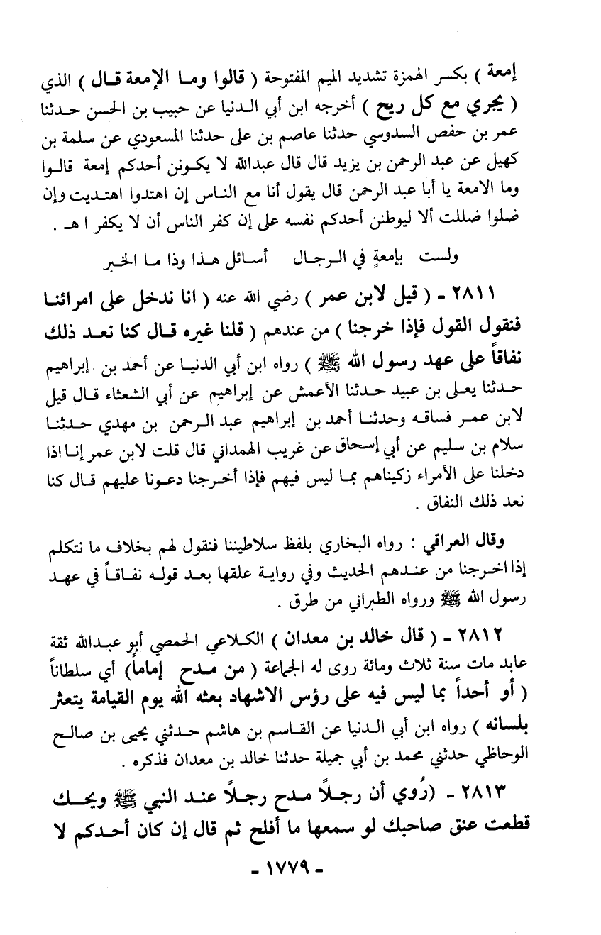 2811 - (قيل لابن عمر) رضي الله عنه (إنا ندخل على أمرائنا فنقول القول فإذا خرجنا) من عندهم (قلنا غيره قال كنا نعد ذلك نفاقاً على عهد رسول الله - صلّى الله عليه وسلم -) رواه ابن أبي الدنيا عن أحمد بن إبراهيم حدثنا يعلى بن عبيد حدثنا الأعمش عن إبراهيم عن أبي الشعثاء قال قيل لابن عمر فساقه وحدثنا أحمد بن إبراهيم عبد الرحمن بن مهدي حدثنا سلام بن سليم عن أبي إسحاق عن غريب الهمداني قال قلت لابن عمر إنا إذا دخلنا على الأمراء زكيناهم بما ليس فيهم فإذا أخرجنا دعونا عليهم قال كنا نعد ذلك النفاق.
