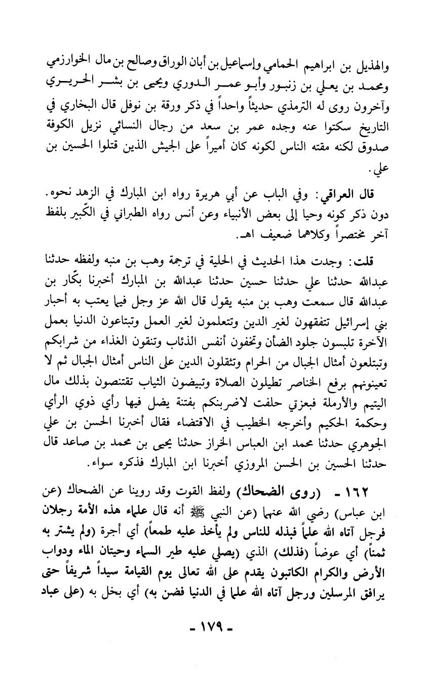 162 - (روى الضحاك) ولفظ القوت وقد روينا عن الضحاك (عن ابن عباس) رضي الله عنهما (عن النبي - صلى الله عليه وسلم - أنه قال علماء هذه الأمة رجلان فرجل آتاه الله علماً فبذله للناس ولم يأخذ عليه طمعاً) أي أجرة (ولم يشتر به ثمناً) أي عوضاً (فذلك) الذي (يصلي عليه طير السماء وحيتان الماء ودواب الأرض والكرام الكاتبون يقدم على الله تعالى يوم القيامة سيداً شريفاً حتى يرافق المرسلين ورجل آتاه الله علماً في الدنيا فضن به) أي بخل به (على عباد