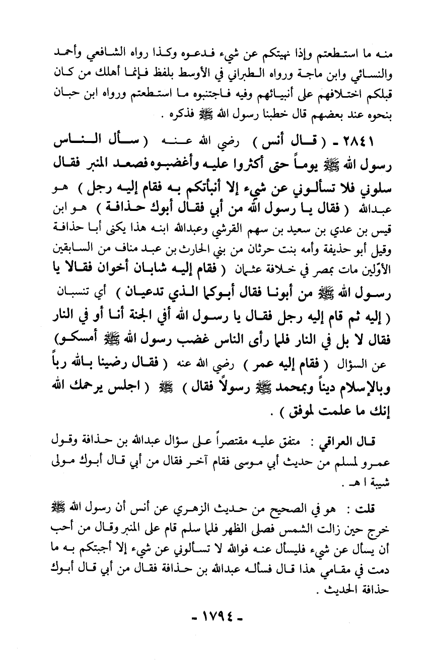 قلت: هو في الصحيح من حديث الزهري عن أنس أن رسول الله - صلّى الله عليه وسلم - خرج حين زالت الشمس فصلى الظهر فلما سلم قام على المنبر وقال من أحب أن يسأل عن شيء فليسأل عنه فوالله لا تسألوني عن شيء إلا أجبتكم به ما دمت في مقامي هذا قال فسأله عبد الله بن حذافة فقال من أبي قال أبوك حذافة الحديث.