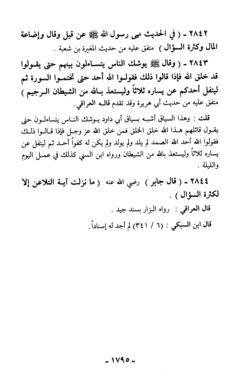 2843 - (وقال - صلّى الله عليه وسلم - يوشك الناس يتساءلون بينهم حتى يقولوا قد خلق الله فإذا قالوا ذلك فقولوا الله أحد حتى تختموا السورة ثم ليتفل أحدكم عن يساره ثلاثاً وليستعذ بالله من الشيطان الرجيم) متفق عليه من حديث أبي هريرة وقد تقدم قاله العراقي.