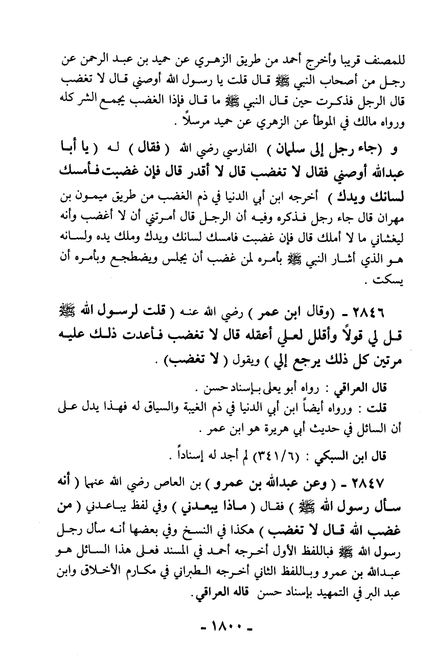 2846 - (وقال ابن عمر) رضي الله عنه (قلت لرسول الله - صلّى الله عليه وسلم - قل لي قولاً وأقلل لعلي أعقله قال لا تغضب فأعدت ذلك عليه مرتين كل ذلك يرجع إلي) ويقول (لا تغضب).