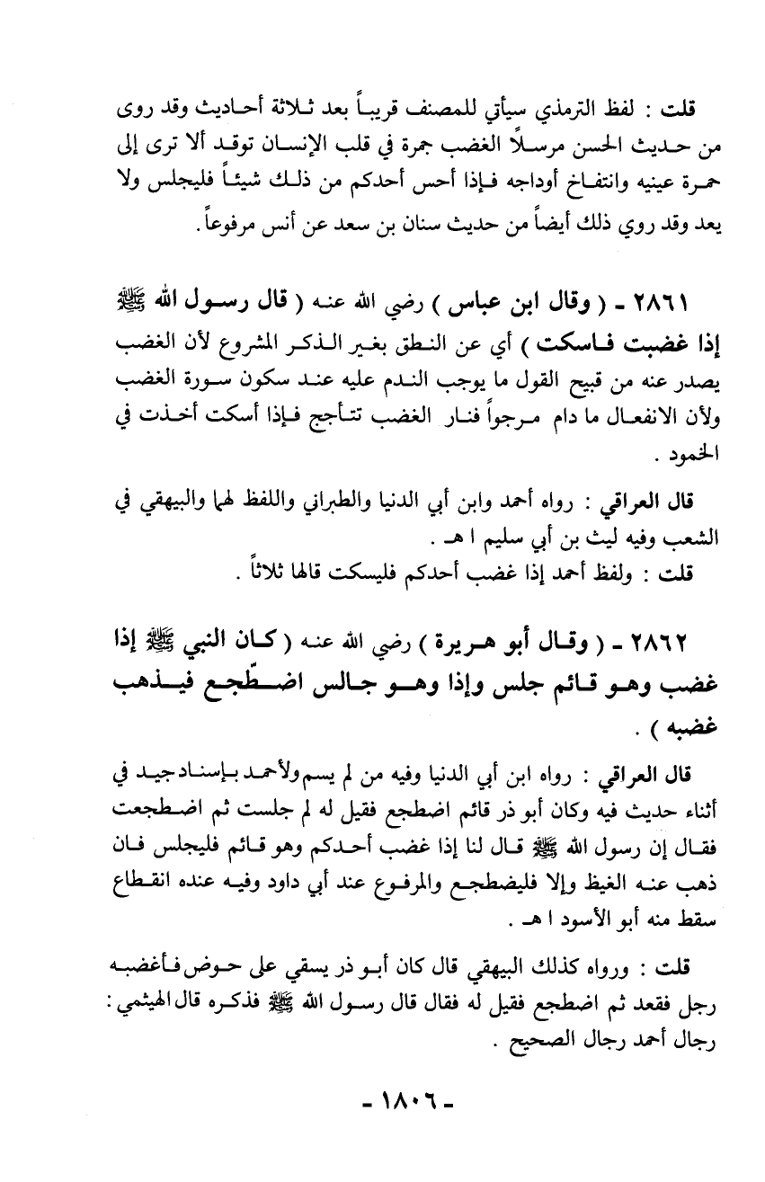 2862 - (وقال أبو هريرة) رضي الله عنه (كان النبي - صلّى الله عليه وسلم - إذا غضب وهو قائم جلس وإذا وهو جالس اضّطجع فيذهب غضبه).