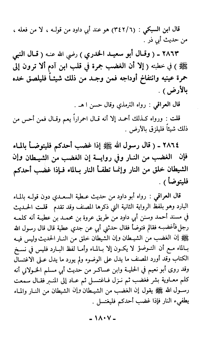 قال العراقي: رواه أبو داود من حديث عطية السعدي دون قوله بالماء البارد وهو بلفظ الرواية الثانية التي ذكرها المصنف وقد تقدم قلت الحديث في مسند أحمد وسنن أبي داود من طريق عروة بن محمد بن عطية أنه كلمه رجل فأغضبه فقام فتوضأ فقال حدثني أبي عن جدي عطية قال قال رسول الله - صلّى الله عليه وسلم - إن الغضب من الشيطان وإن الشيطان خلق من النار الحديث وليس فيه بالماء مع أن التوضؤ لا يكون إلا بالماء وأما لفظ البارد فليس في نسخ الكتاب وقد أورد المصنف ما يدل على الوضوء ولم يورد ما يدل على الاغتسال وقد روى أبو نعيم في الحلية وابن عساكر من حديث أبي مسلم الخولاني أنه كلم معاوية بشر فغضب ثم نزل فاغتسل ثم عاد إلى المنبر فقال سمعت رسول الله - صلّى الله عليه وسلم - يقول إن الغضب من الشيطان وإن الشيطان من النار والماء يطفئ النار فإذا غضب أحدكم فليغتسل.
