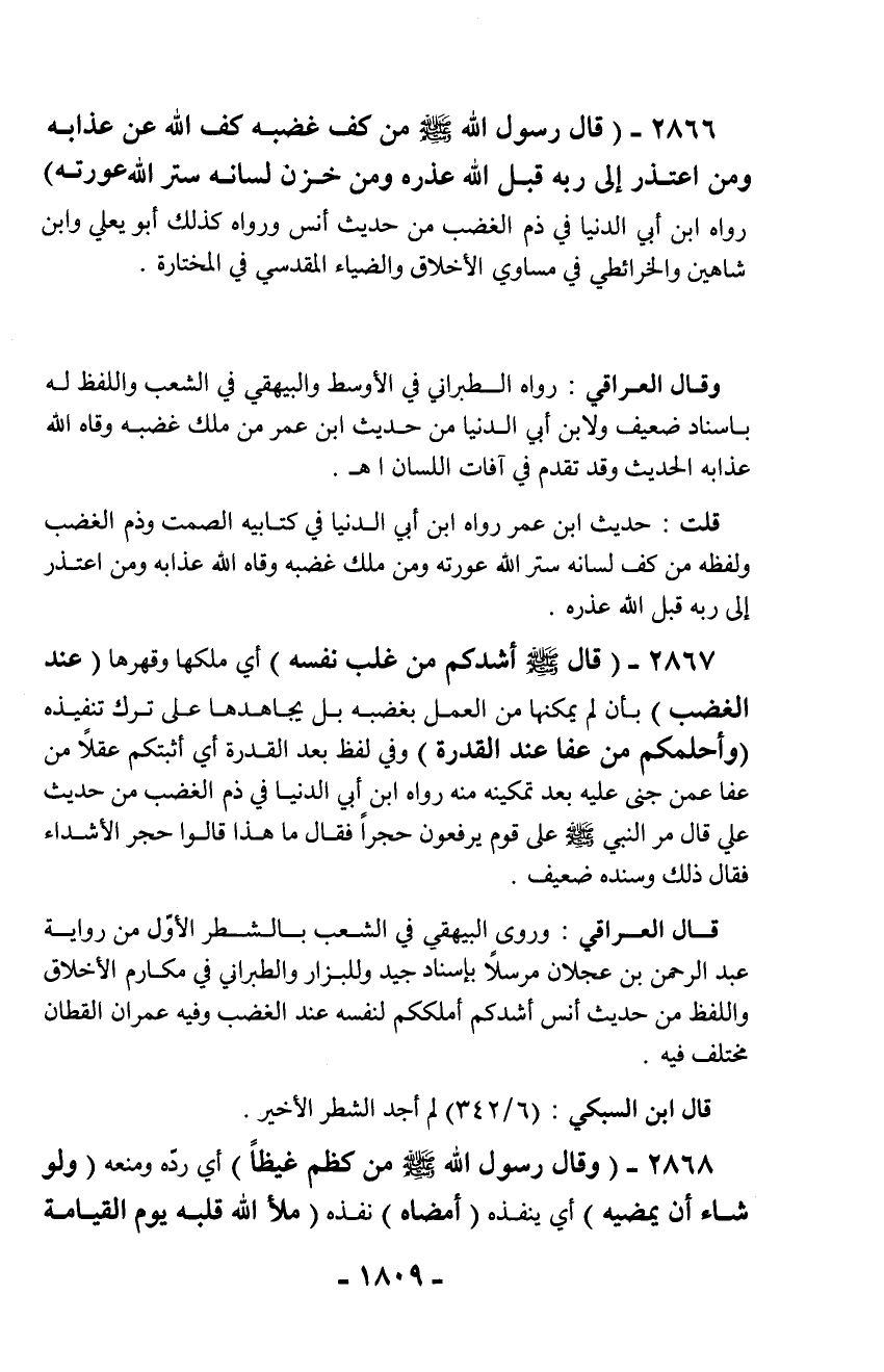 وقال العراقي: رواه الطبراني في الأوسط والبيهقي في الشعب واللفظ له بإسناد ضعيف ولابن أبي الدنيا من حديث ابن عمر من ملك غضبه وقاه الله عذابه الحديث وقد تقدم في آفات اللسان اهـ.