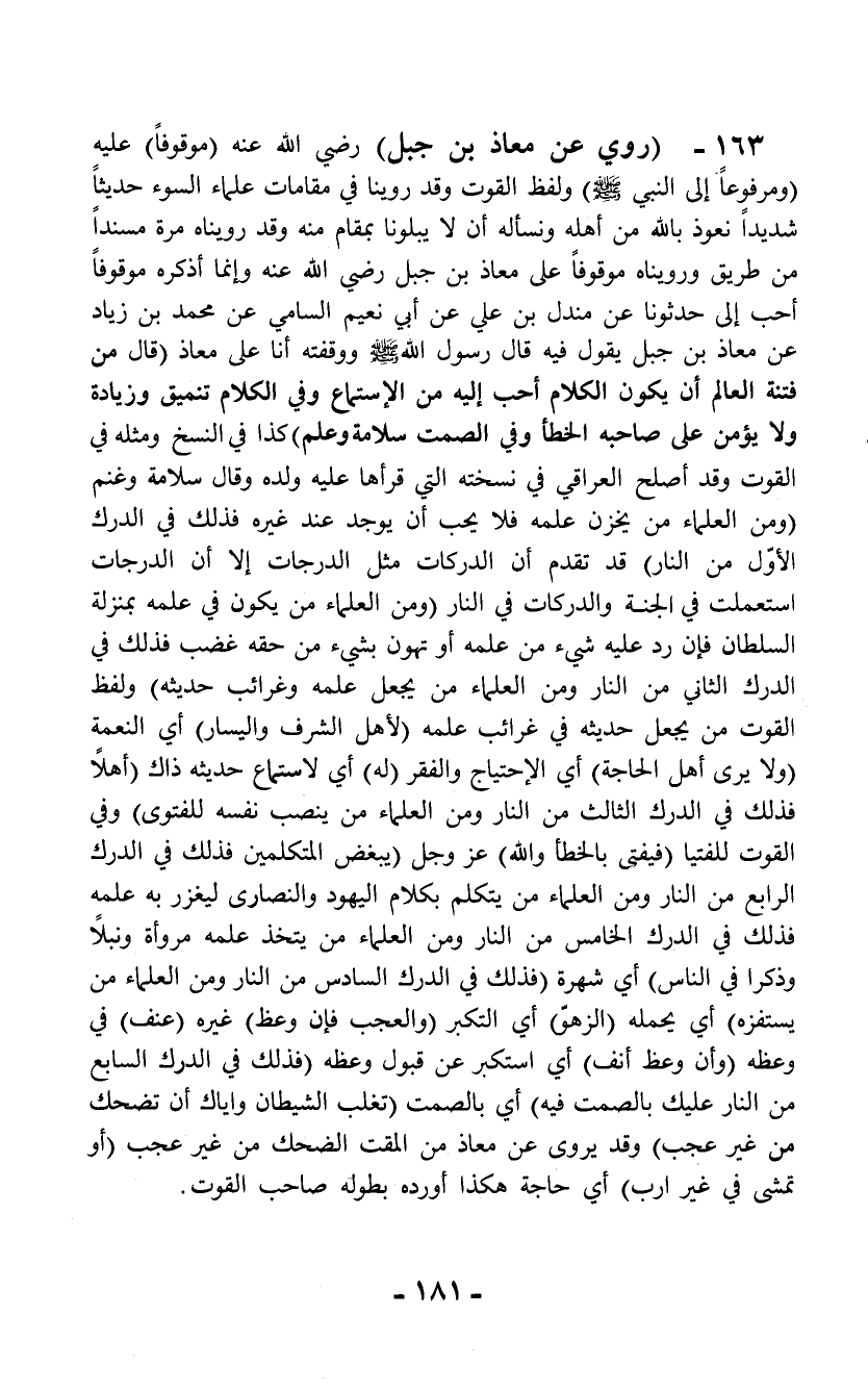 163 - (روي عن معاذ بن جبل) رضي الله عنه (موقوفاً) عليه (ومرفوعاً إلى النبي - صلى الله عليه وسلم -) ولفظ القوت وقد روينا في مقامات علماء السوء حديثاً شديداً نعوذ بالله من أهله ونسأله أن لا يبلونا بمقام منه وقد رويناه مرة مسنداً من طريق ورويناه موقوفاً على معاذ بن جبل رضي الله عنه وإنما أذكره موقوفاً أحب إلى حدثونا عن مندل بن علي عن أبي نعيم السامي عن محمد بن زياد عن معاذ بن جبل يقول فيه قال رسول الله - صلى الله عليه وسلم - ووقفته أنا على معاذ (قال من فتنة العالم أن يكون الكلام أحب إليه من الاستماع وفي الكلام تنميق وزيادة ولا يؤمن على صاحبه الخطأ وفي الصمت سلامة وعلم) كذا في النسخ ومثله في القوت وقد أصلح العراقي في نسخته التي قرأها عليه ولده وقال سلامة وغنم (ومن العلماء من يخزن علمه فلا يحب أن يوجد عند غيره فذلك في الدرك الأوّل من النار) قد تقدم أن الدركات مثل الدرجات إلا أن الدرجات استعملت في الجنة والدركات في النار (ومن العلماء من يكون في علمه بمنزلة السلطان فإن رد عليه شيء من علمه أو تهون بشيء من حقه غضب فذلك في الدرك الثاني من النار ومن العلماء من يجعل علمه وغرائب حديثه) ولفظ القوت من يجعل حديثه في غرائب علمه (لأهل الشرف واليسار) أي النعمة (ولا يرى أهل الحاجة) أي الاحتياج والفقر (له) أي لاستماع حديثه ذاك (أهلاً فذلك في الدرك الثالث من النار ومن العلماء من ينصب نفسه للفتوى) وفي القوت للفتيا (فيفتى بالخطأ والله) عز وجل (يبغض المتكلمين فذلك في الدرك الرابع من النار ومن العلماء من يتكلم بكلام اليهود والنصارى ليغزر به علمه فذلك في الدرك الخامس من النار ومن العلماء من يتخذ علمه مروءة ونبلاً وذكرا في الناس) أي شهرة (فذلك في الدرك السادس من النار ومن العلماء من يستفزه) أي يحمله (الزهوّ) أي التكبر (والعجب فإن وعظ) غيره (عنف) في وعظه (وأن وعظ أنف) أي استكبر عن قبول وعظه (فذلك في الدرك السابع من النار عليك بالصمت فيه) أي بالصمت (تغلب الشيطان وإياك أن تضحك من غير عجب) وقد يروى عن معاذ من المقت الضحك من غير عجب (أو تمشى في غير إرب) أي حاجة هكذا أورده بطوله صاحب القوت.
