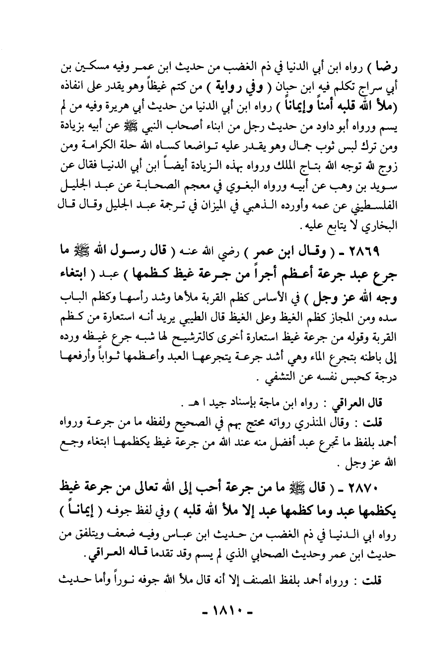 2870 - (قال - صلّى الله عليه وسلم - ما من جرعة أحب إلى الله تعالى من جرعة غيظ يكظمها عبد وما كظمها عبد إلا ملأ الله قلبه) وفي لفظ جوفه (إيماناً) رواه أبي الدنيا في ذم الغضب من حديث ابن عباس وفيه ضعف ويتلفق من حديث ابن عمر وحديث الصحابي الذي لم يسم وقد تقدما قاله العراقي.